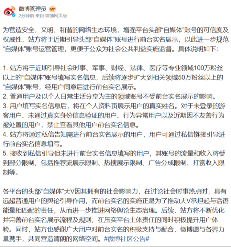 微博站方将于近期引导头部“自媒体”账号进行前台实名展示,以此进一步规范“自媒体”账号运营管理,站方将于近期引导社会时事、军事、财经、法律、医疗等专业领域100万粉丝以上的“自媒体”账号填写实名信息,后续将逐步扩大到相关领域50万粉丝以上的“自媒体”账号,经用户同意后进行前台实名展示。