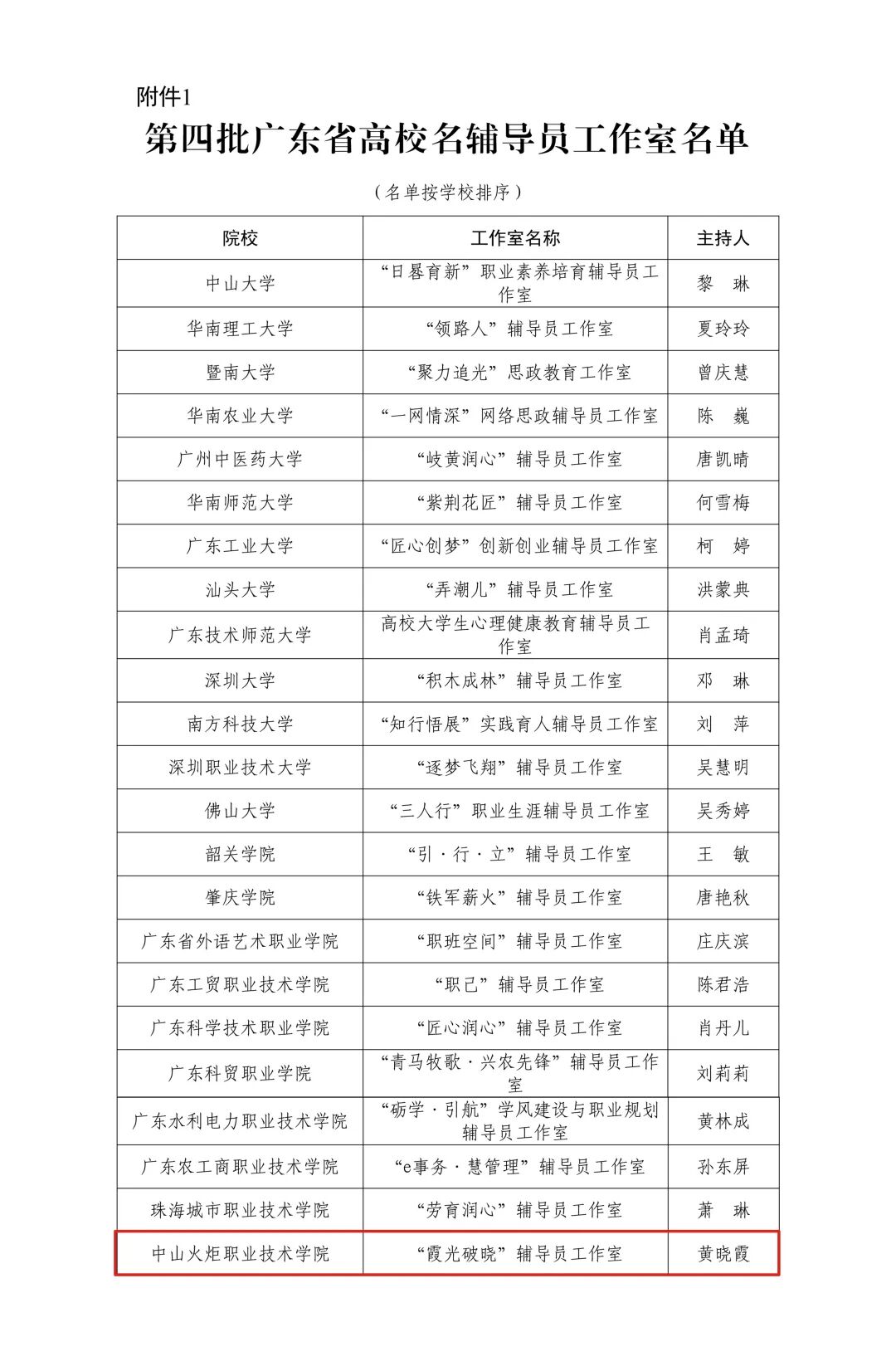 近日,广东省第四批高校名辅导员工作室立项名单正式公布。本批次共立项23个工作室,其中本科院校15个,高职院校仅8个。由中山火炬职业技术学院光电信息学院党总支副书记黄晓霞主持的“霞光破晓”辅导员工作室成功入选,成为“全省高职八席之一、全市高校唯一”入选的工作室。