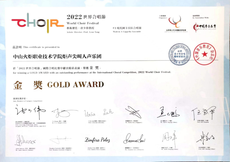 黄晓霞(后排右二)、工作室成员蔡志宁老师(后排右三)带领学生参加2022年世界合唱节国际合唱比赛并获得金奖