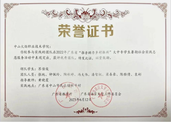 “炬声尖叫人声乐团”青年服务队获评广东省大中专学生暑期社会实践志愿服务优秀团队