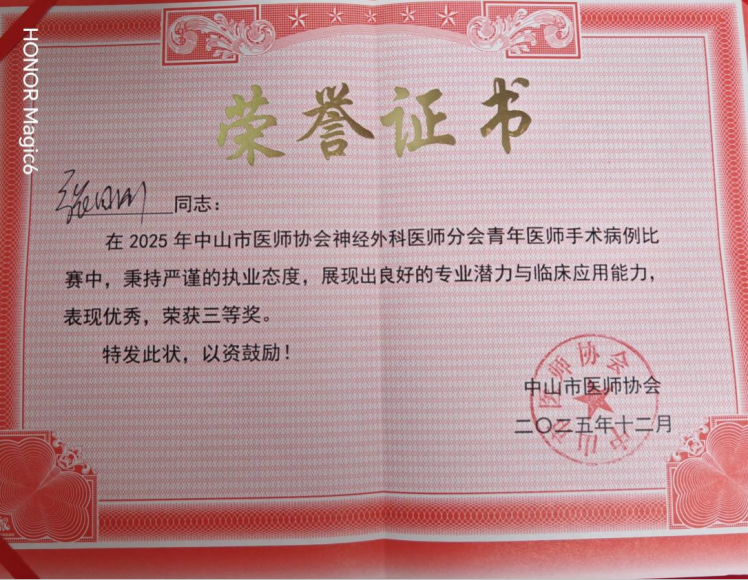 当天的活动亮点,青年医师手术病例比赛,吸引全市13家医疗机构选派精英参赛。中山市第六人民医院神经外科张国刚主治医师以《一例中型颅脑损伤的救治体会》为题,通过动态影像还原救治过程,展示中山市第六人民医院神经外科在颅脑损伤方面的规范性、专业性和高质量、高效能的救治能力,其严谨的诊疗逻辑与创新性技术方案获得评委高度认可,最终斩获三等奖。