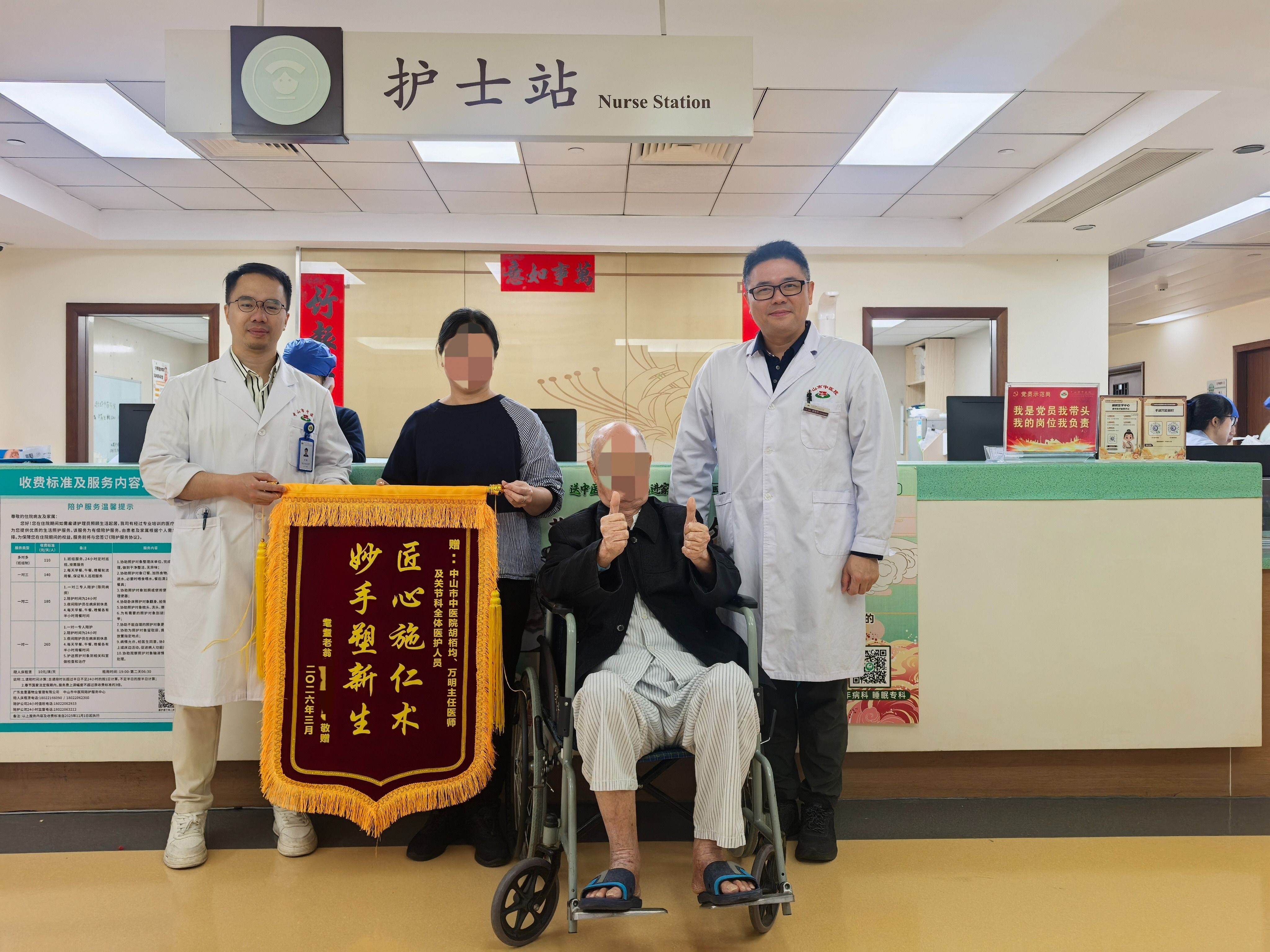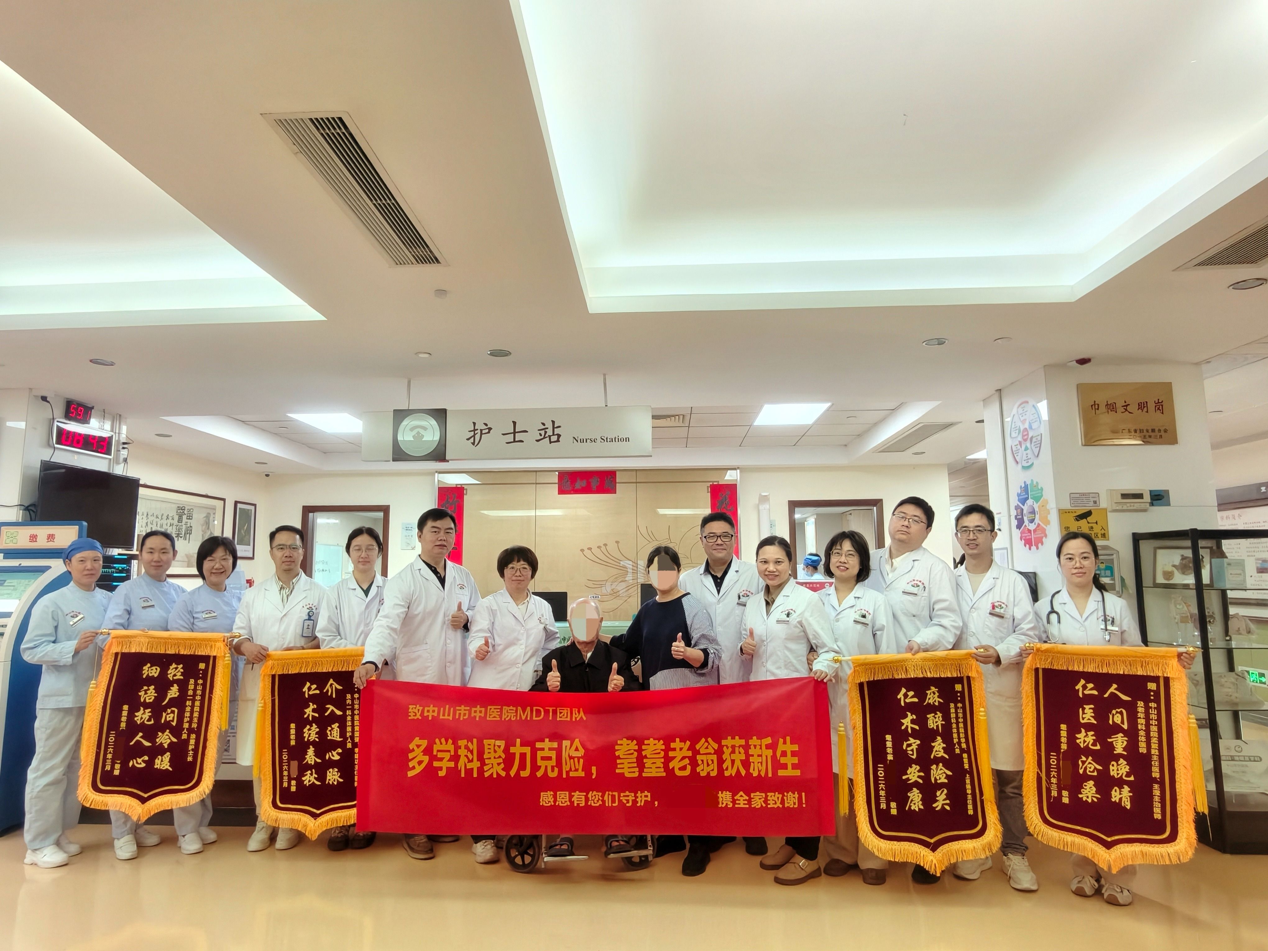 近日,中山市中医院(以下简称“市中医院”)依托多学科协作诊疗模式,成功救治一名90岁高龄的股骨颈骨折合并冠状动脉血管重度狭窄患者黄爷爷(化名)。医院为其先后精准实施右侧人工股骨头置换术、冠脉造影+支架植入术,全程严密防控多重医疗风险,助老人闯过骨折、隐匿性心肌梗死两道生死关,最终顺利康复出院并恢复自主活动能力,充分彰显了医院在高龄复杂病例综合救治中的专业硬实力与暖心人文关怀。