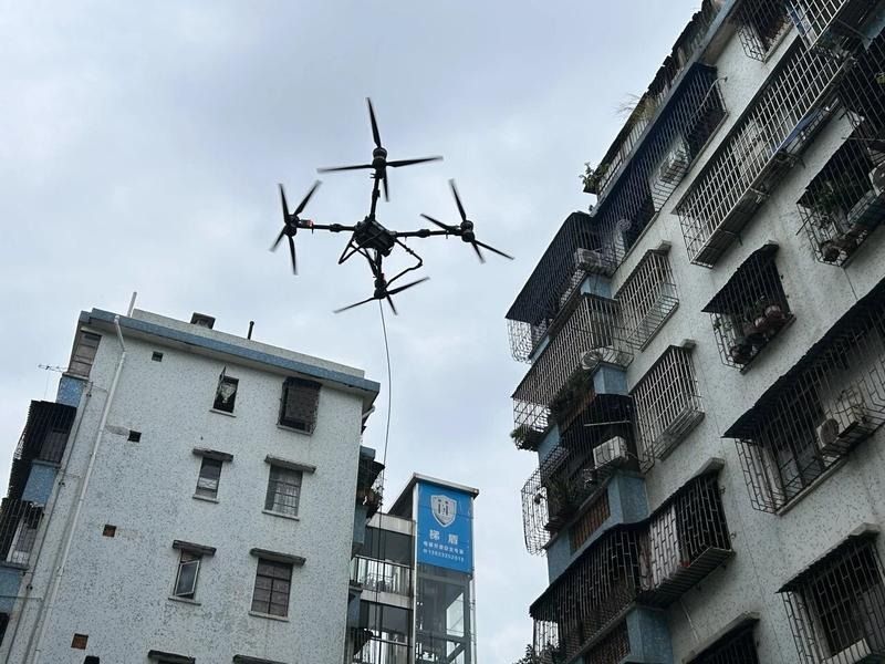 企业作为社会治理的重要力量,其技术优势正成为精准防控的关键支撑。东区街道花苑社区对接江苏中飞智能技术服务有限公司,为社区“两热”(基孔肯雅热和登革热)防控工作提供智能无人飞行器技术支持,助力疫情防控,将废弃家具、花草、花盆等杂物直接吊运至地面垃圾车。工作人员只需提前打包、挂在吊绳上便可由无人机进行运载,单次最大吊运100公斤,配备自动脱钩装置,极大提升了清理效率,也解决了高空作业难题。