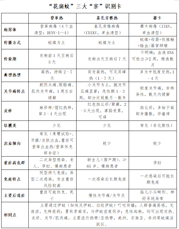 登革热、基孔肯雅热和寨卡病毒三者之间的具体异同,可看“花斑蚊”三大“害”识别卡: