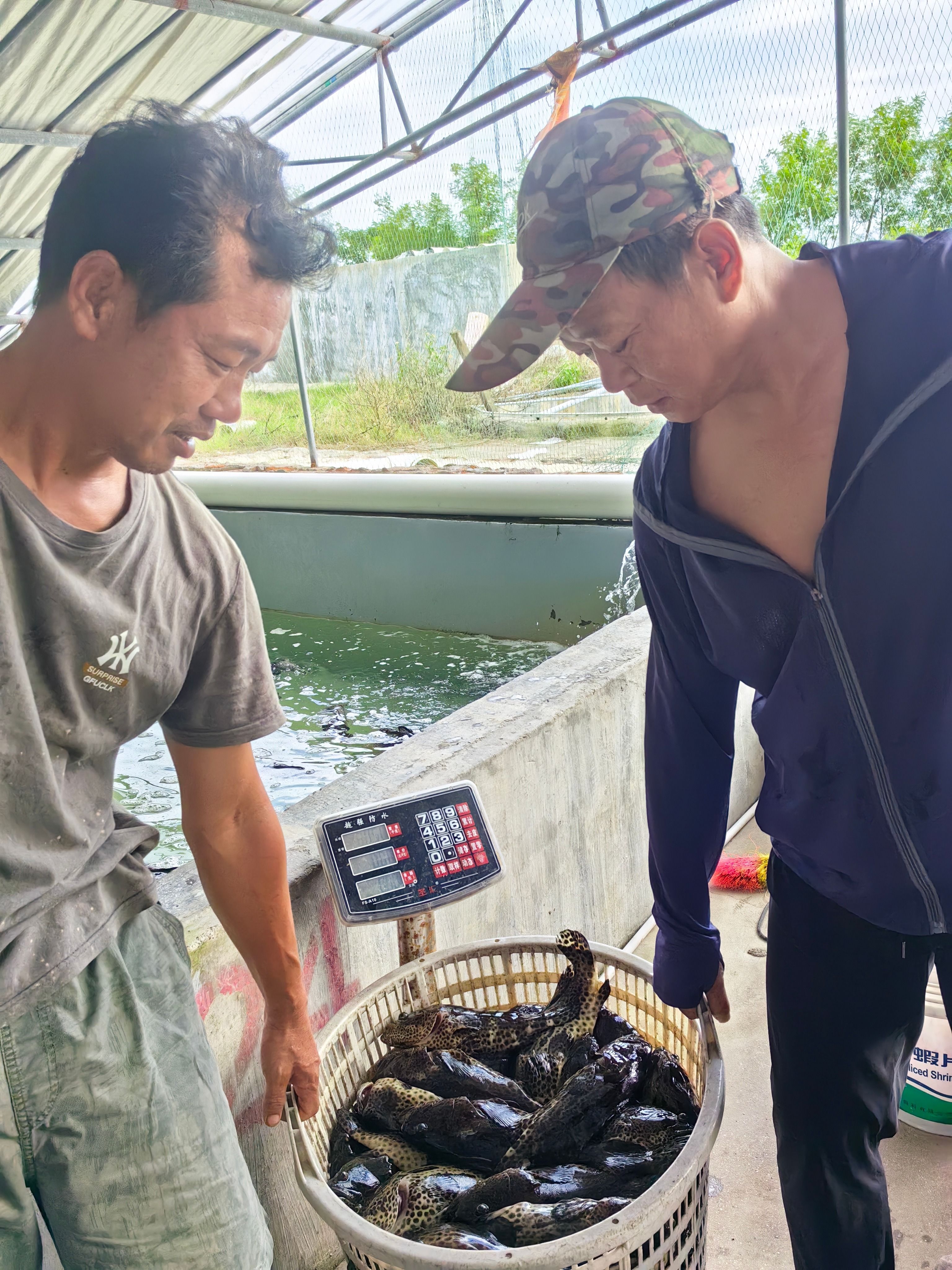 10月14日上午,潮州市饶平县海山镇隆东石斑鱼养殖场内一派忙碌景象:白色塑料筐里装着数十条龙趸石斑成鱼,两名工作人员把塑料筐放在电子台秤上称重;另一侧,鳍边泛着亮黄的龙趸石斑种鱼待在圆形网兜中,不久后便将发往湛江、福建等地。这样的场景背后,是中山市南头镇组团帮扶工作队(以下简称“中山工作队”)为当地破解特色养殖困局的扎实实践,折射出龙趸石斑鱼“成鱼畅销、种鱼走旺”的良好态势。