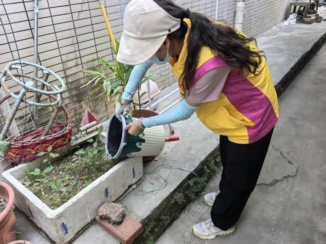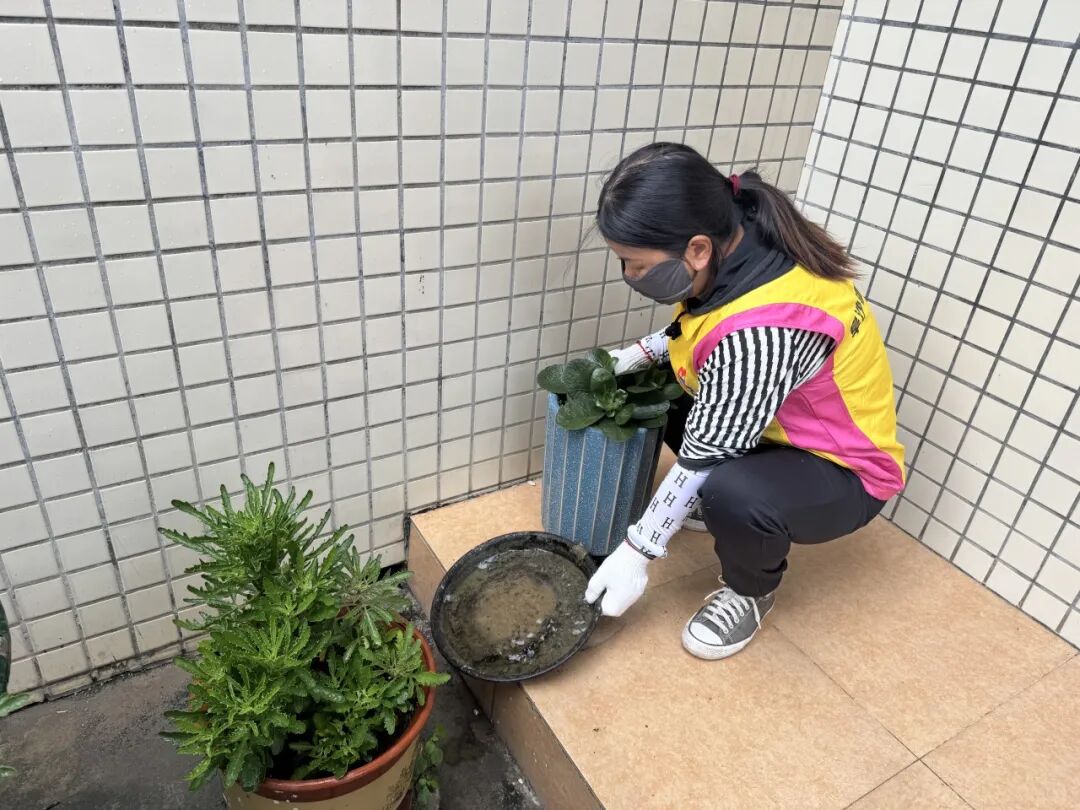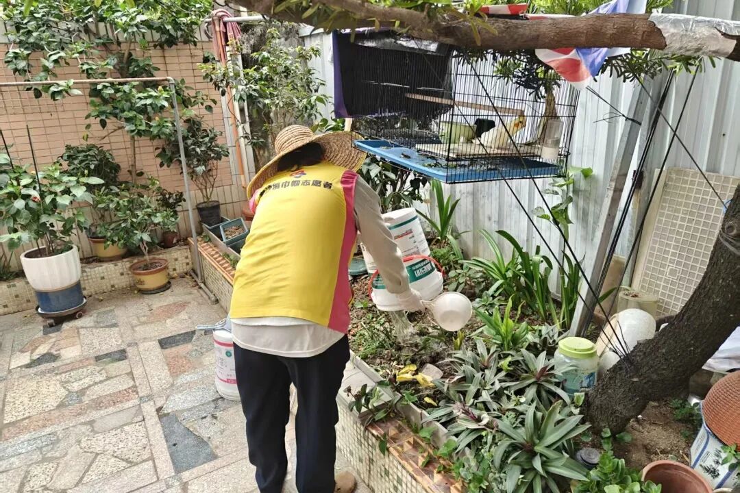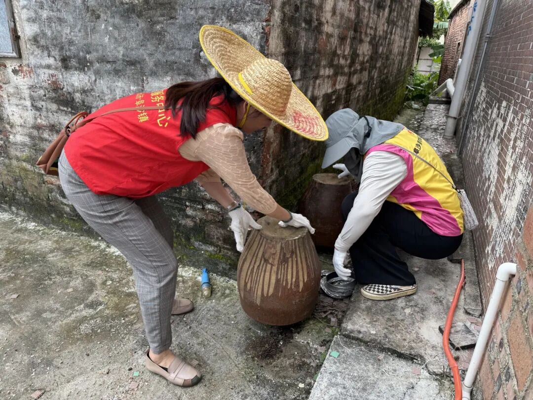 在居民房前屋后,她们弯腰捡拾散落的空瓶罐,协助居民倒除花盆托盘、闲置水桶中的积水。