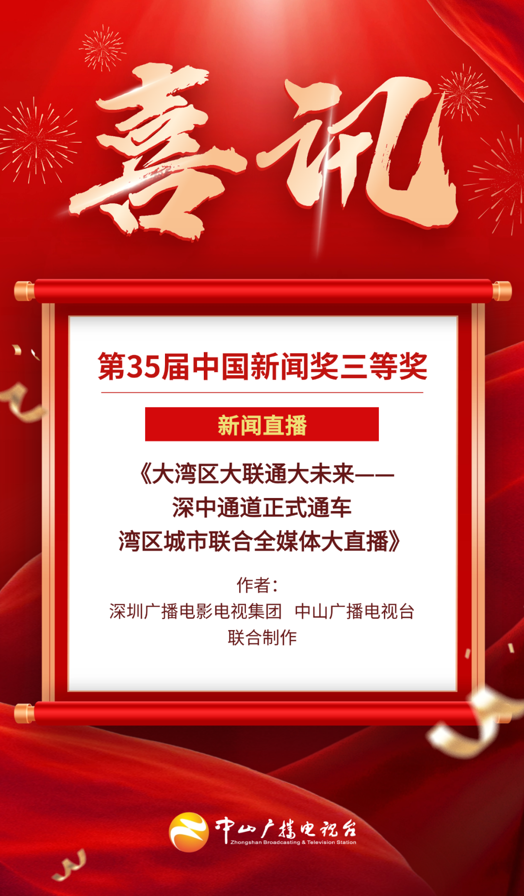 由中华全国新闻工作者协会主办的第35届中国新闻奖评选结果今天揭晓,来自全国各级各类媒体的377件作品获中国新闻奖。其中,由深圳广播电影电视集团、中山广播电视台联合创作的《大湾区 大联通大未来——深中通道正式通车湾区城市联合全媒体大直播》荣获第35届中国新闻奖新闻直播三等奖!这是继2020年之后,中山广播电视台再次获得中国新闻奖。