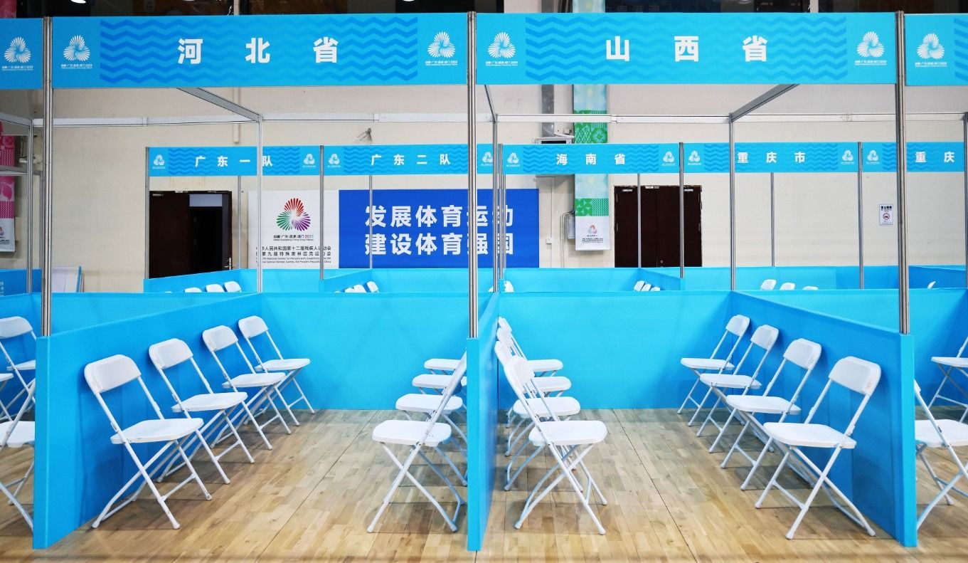 布置工作远不止于悬挂标语和背景板。曹骏杰详细说明:“我们进行了多次现场勘察和整体空间设计,按照裁判长要求,对赛场进行了全方位的氛围营造。这包括高空的飘旗、地面的指引系统、无障碍标识、观众席围栏装饰、各功能区域,如休息区、等候区的明确标识等。”这些细致入微的布置,旨在为运动员、裁判、观众营造一个既符合竞赛规范,又充满支持与鼓励的赛场环境,确保每一位参与者都能感受到便捷、尊重与温暖。