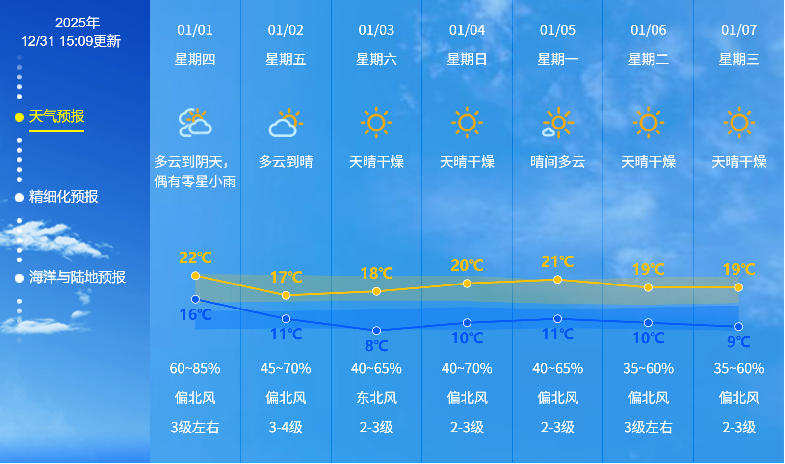 预计1月1日云量增多,偶有零星小雨,傍晚到夜间受较强冷空气影响,北风加大,2-3日气温显著下降,过程最低气温8℃左右;展望4-6日天晴干燥,早晚寒冷。目前我市森林火险橙色预警正在生效,请注意用火用电安全;昼夜温差大,请注意适时添减衣物。