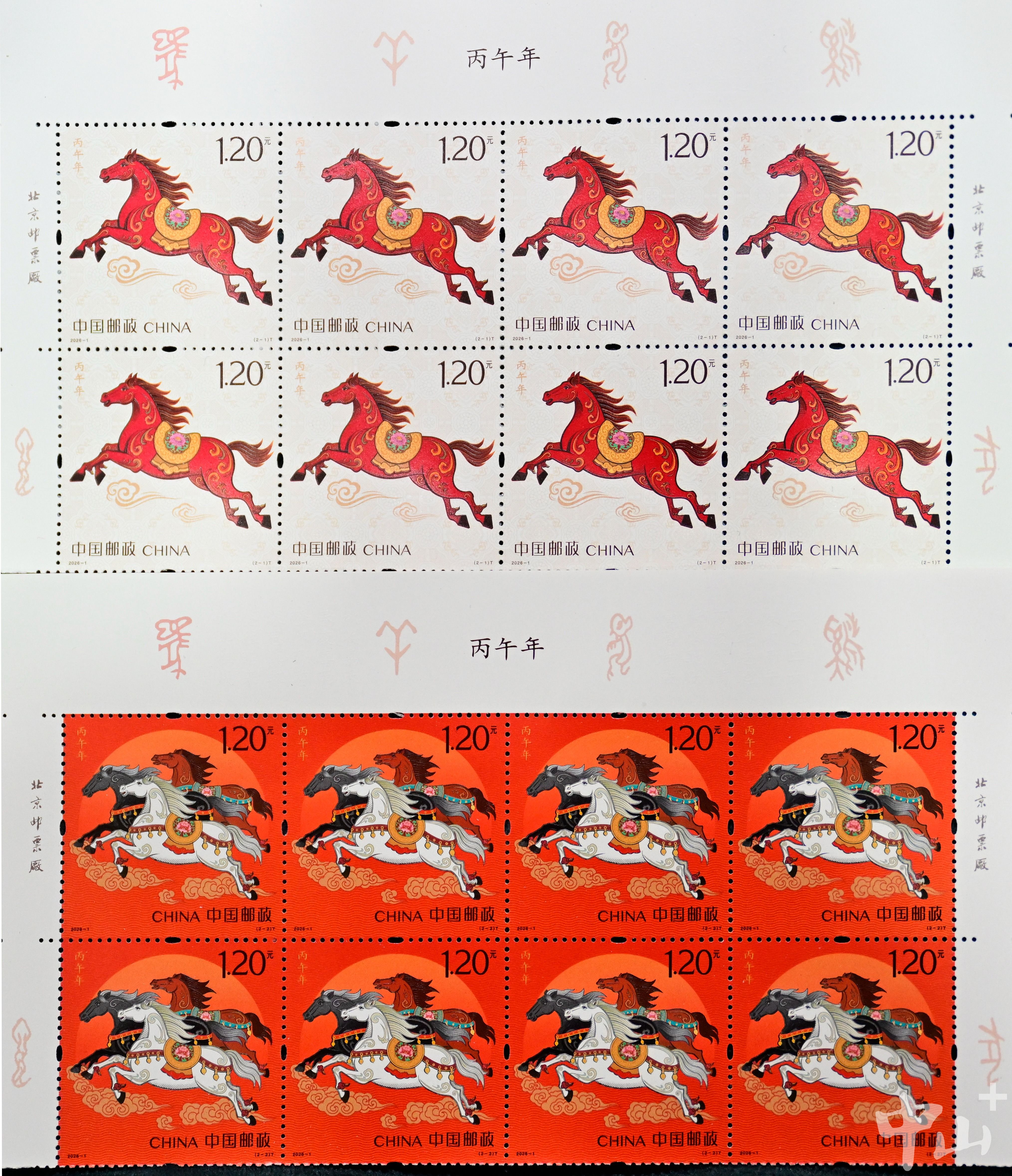《丙午年》马年邮票全套2枚,每枚面值1.2元。第一枚“驰跃宏图”展现红马腾跃祥云之间,鬃毛如火焰舞动,寓意自强不息;第二枚“万骏臻福”以三匹骏马共同构成“万马奔腾”的壮丽画面,融入祥云纹、火焰纹等传统纹饰,将东方美学与时代精神相融合,传递奋发向上、团结和谐的美好寓意。据了解,该套邮票自1月5日起在全国指定邮政网点、集邮网厅、中国邮政手机客户端等渠道同步发售,出售期限为6个月。
