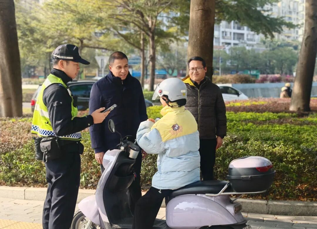 街道党工委副书记、办事处主任李全庆深入辖区重点路口,对未佩戴头盔、违规载人等行为开展文明劝导,叮嘱群众要自觉遵守交通法规,现场派发《安全出行指南》,并对现场值守的交警和志愿者致以慰问,肯定他们在寒风中坚守岗位的工作热情。