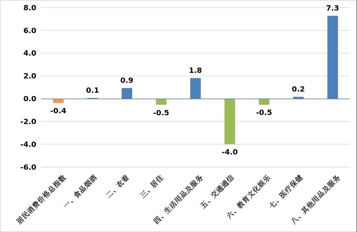2025年,构成CPI的八大类商品和服务价格“五涨三降”。其中,其他用品及服务价格上涨7.3%,生活用品及服务价格上涨1.8%,衣着价格上涨0.9%,医疗保健价格上涨0.2%,食品烟酒价格上涨0.1%;交通通信价格下降4.0%,教育文化娱乐价格下降0.5%,居住价格下降0.5%。
