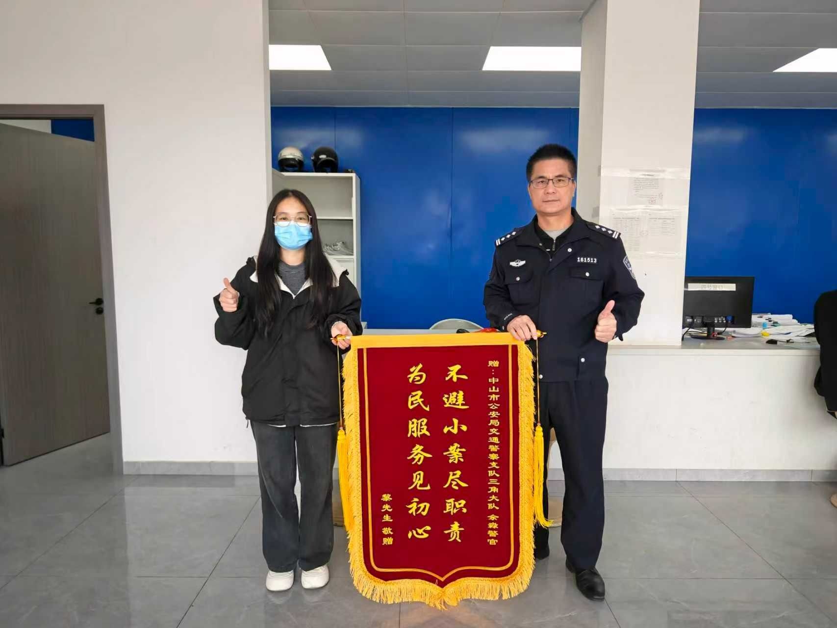 三角交警获群众锦旗致谢。通讯员供图