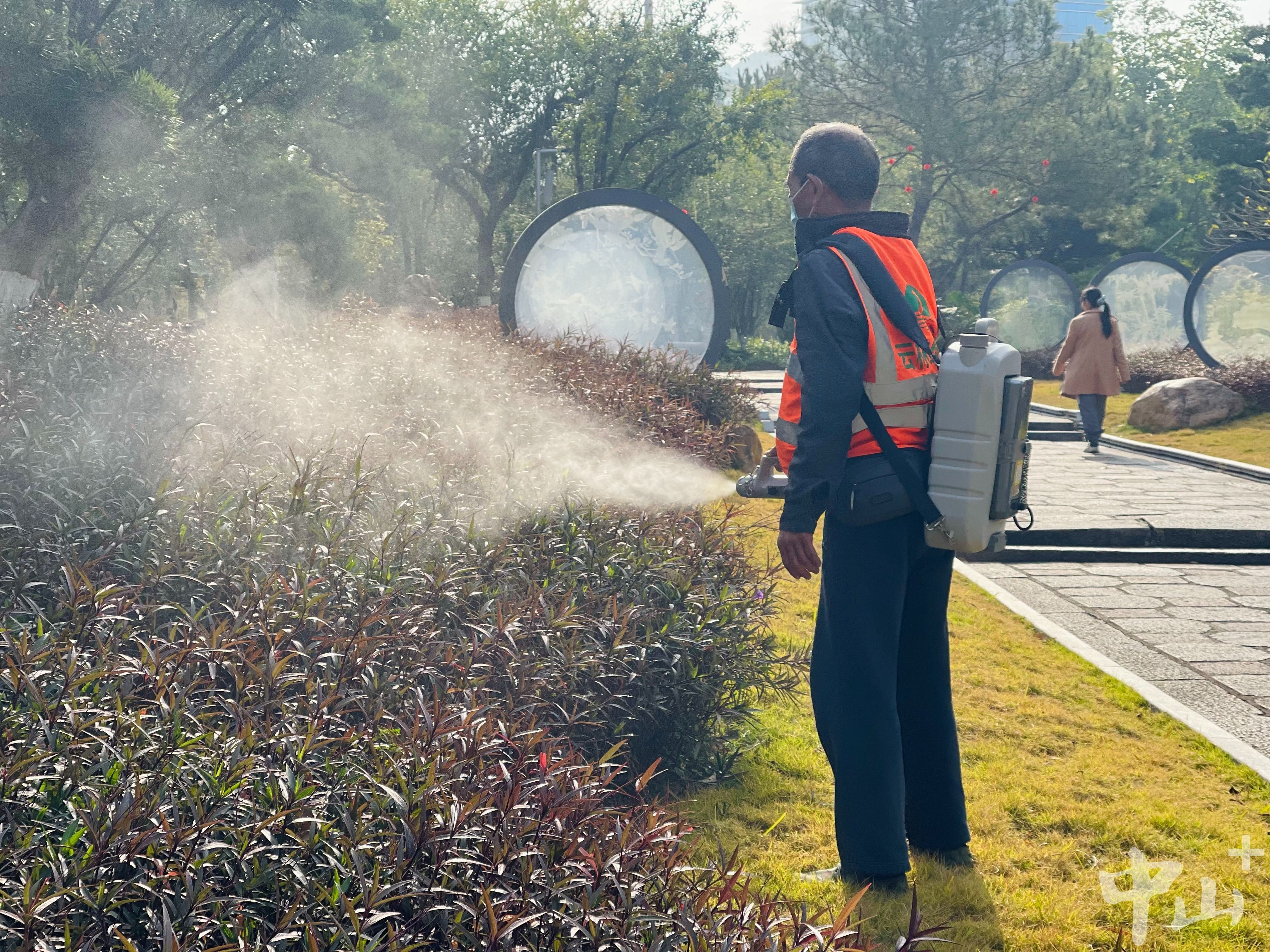 2月13日早上,名树园公园的草坪边,园林工人正在一处低矮的绿化带旁,用超低容量喷雾机喷洒药液。连日来,中山市城市管理和综合执法局精密调度市园林中心、环卫中心等同时作战,将灭蚊防病工作融入城市精细化管理与春节前市容环境提升之中,为市民游客营造干净舒适的过节环境。