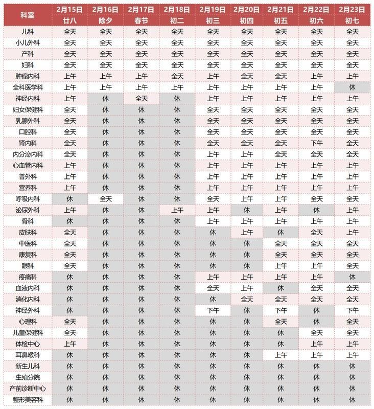 医学美容中心、健康管理中心:2月14日全天、28日全天开诊;2月15-23日全天停诊。