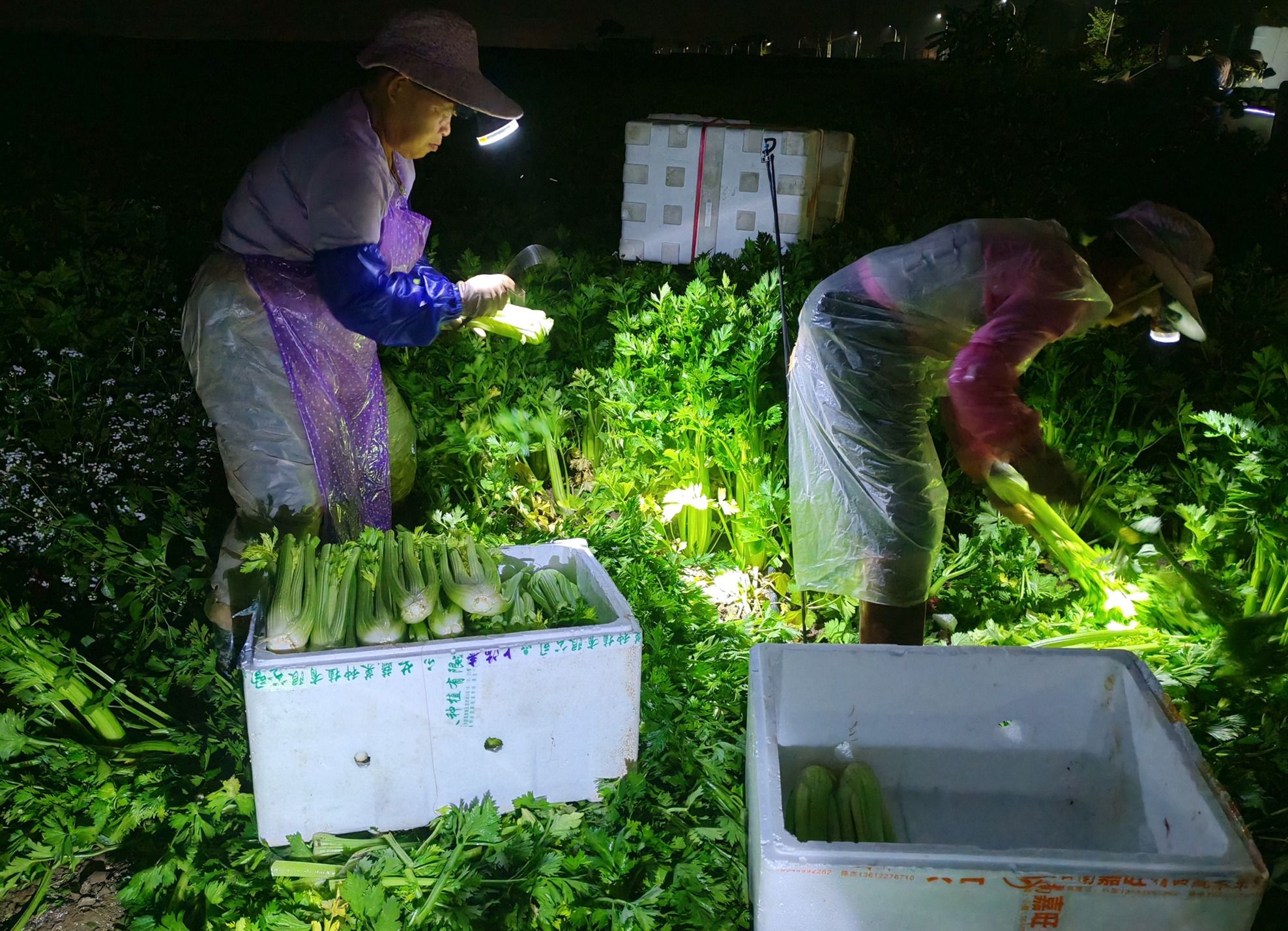 当天凌晨3时,彩虹大道附近由领创农业有限公司打造的西芹种植基地已一片繁忙。10多位菜农头戴头灯,手持工具,在田间熟练地收割西芹,近30名工人分批次上阵,割菜、去叶、切秆一气呵成。新鲜采摘的西芹采用泡沫箱密封包装,每箱80斤,一辆运输车可装载340箱,当天采摘的5亩西芹装了两车。“早上3点就得下地,批发市场9点开市,必须在此之前把菜送过去。”领创农业有限公司负责人何镜钊的话,道出了凌晨采摘的缘由。