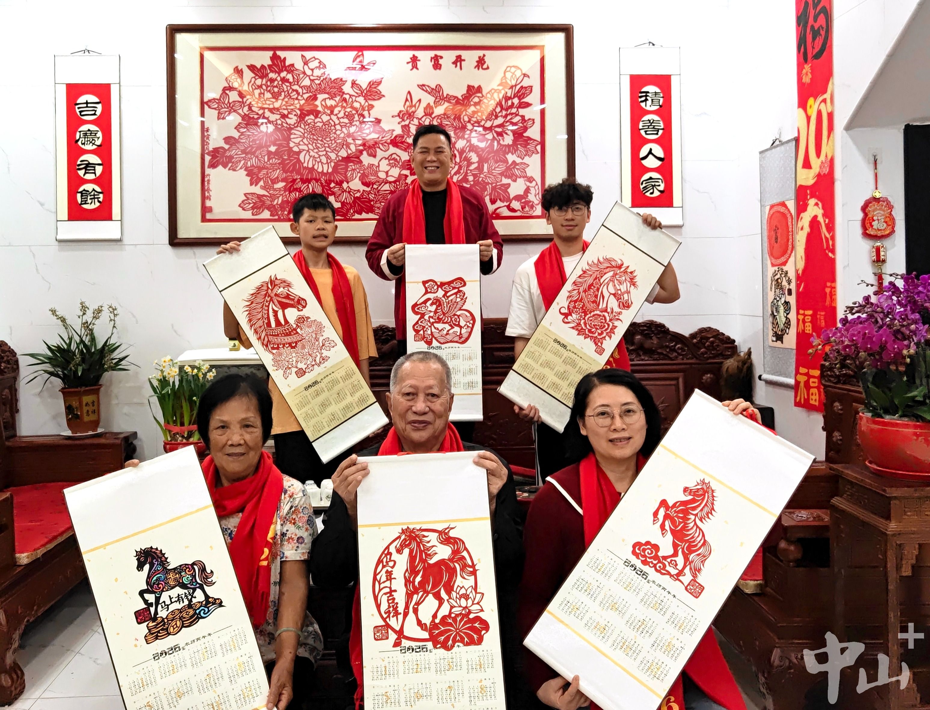 在自己的客厅里,钟国坚与父母、妻子、两个儿子一同手持剪纸新作亮相。作为剪纸世家,钟家每年大年初二,都会以当年生肖剪纸献礼新春。钟国坚介绍,今年恰逢丙午马年,全家围绕“马首是瞻”主题,创作了十幅花果鱼鸟题材的日历挂轴剪纸画,寓意马到功成,十全十美。其中一幅荼薇花绕马头的作品尤为亮眼,以小榄独有的荼薇花为元素,环绕昂首骏马,构图精巧,栩栩如生,让人赞叹不已。
