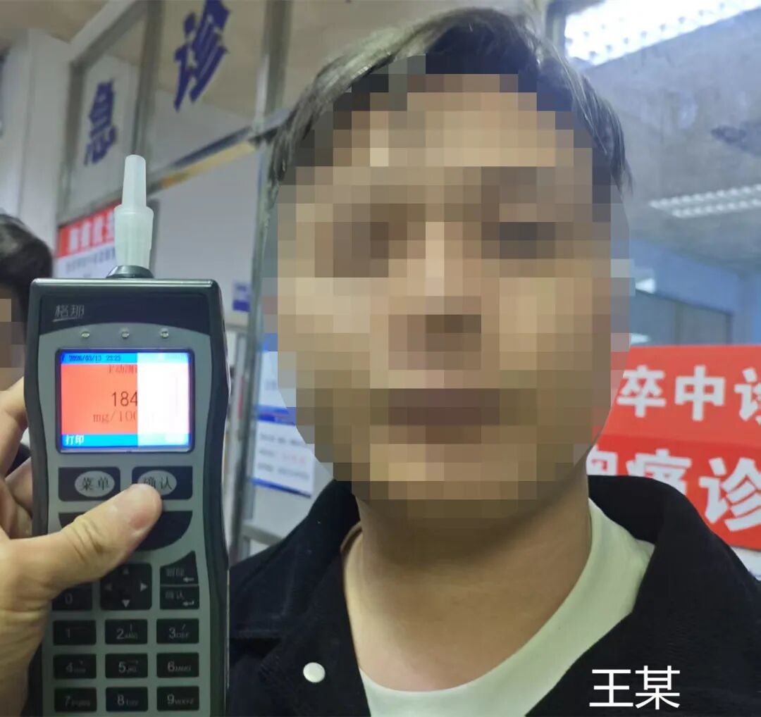 3月13日22时许,王某无证驾驶摩托车行至大涌镇德政路与中新路信号灯路口时,与一辆小客车发生碰撞。大涌交警到达现场后,发现肇事的摩托车驾驶人王某涉嫌酒后驾车,现场检测结果显示呼气酒精含量达184mg/100ml,民警随后将王某带往医院抽血检验。