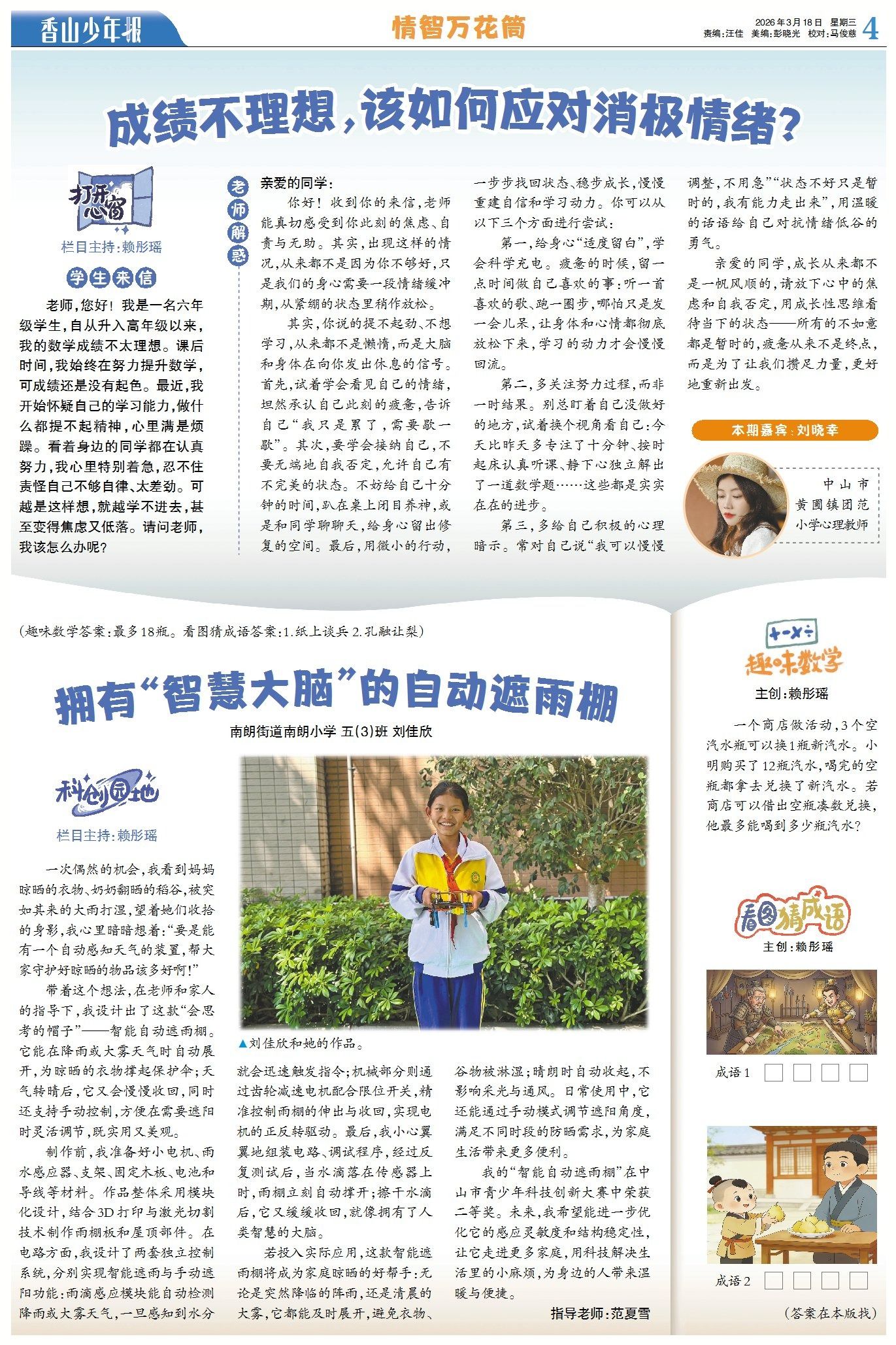 成绩不理想,该如何应对消极情绪?本期《情智万花筒》,老师建议同学要学会接纳负面情绪、适度放松、调整状态,在学习中重拾信心。《科创园地》栏目中,同学受家人晾晒物品被雨打湿的启发,发明了智能自动遮雨棚,该作品可自动遮雨且实用强,用科技解决生活里的小麻烦。(→点击查看详情)
