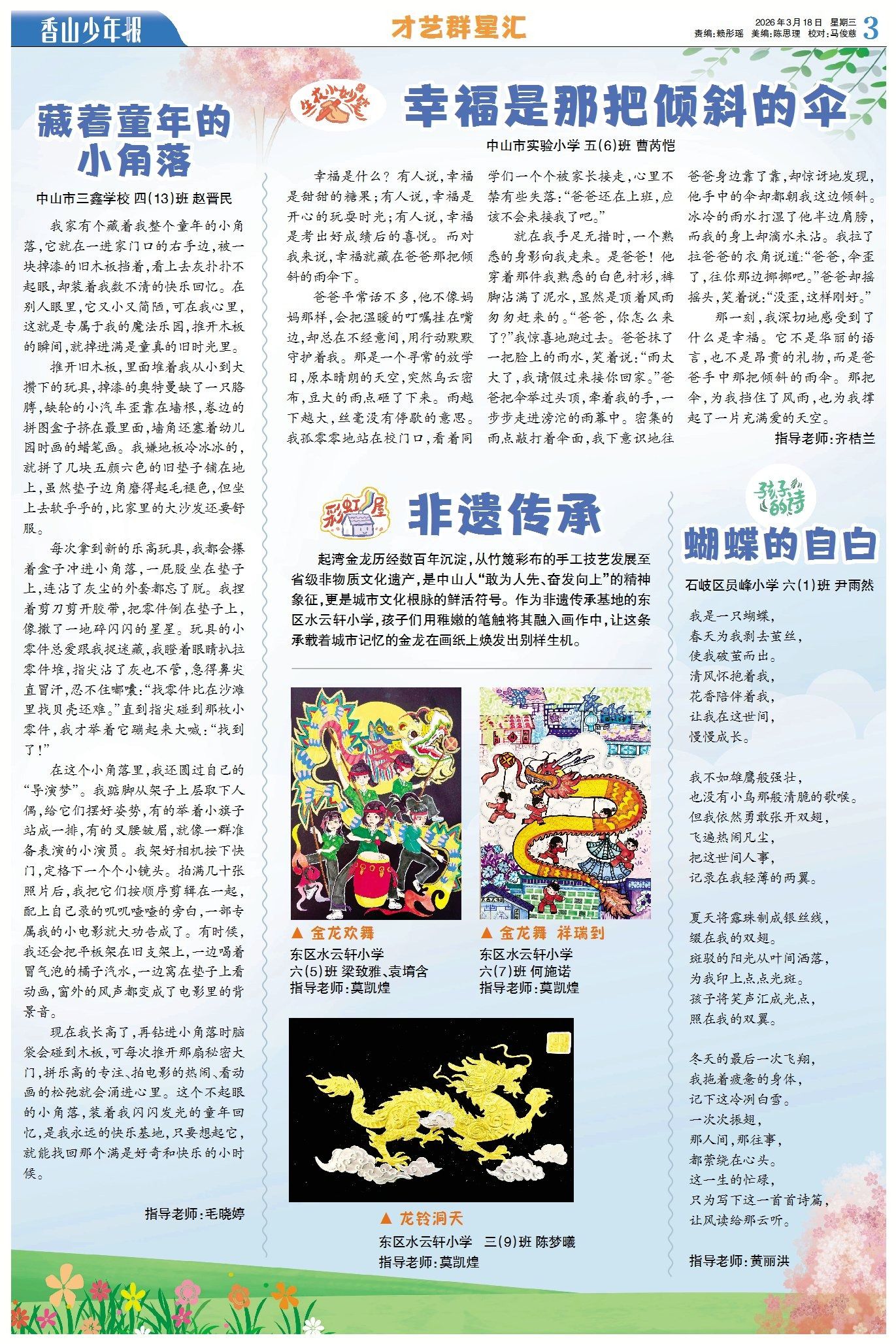 幸福是那把倾斜的伞,懂得父亲默默无言、用行动守护的爱;家中的小角落虽堆满了儿时的旧玩具,却承载了满满的快乐回忆;蝴蝶破茧成长,虽平凡却勇敢的飞翔……本期《才艺群星汇》,用文字记录下平凡生活里的幸福与感动。在彩虹屋,孩子们用稚嫩的笔触将起湾金龙融入画作中,让这条承载着城市记忆的金龙在画纸上焕发出别样生机。(→点击查看详情)