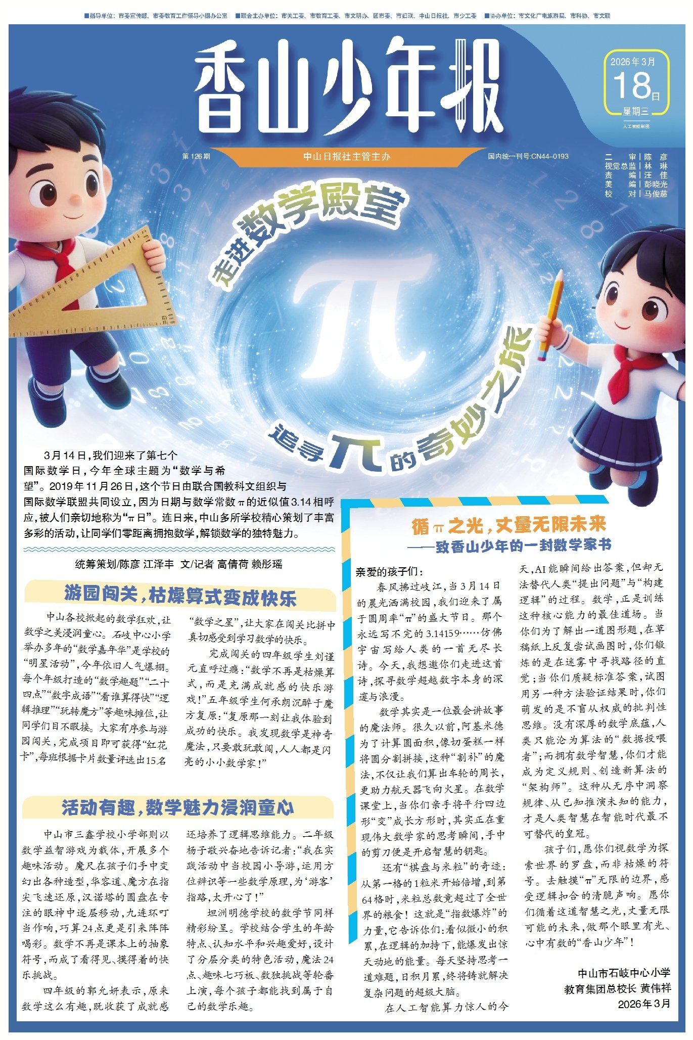 3月14日,我们迎来了第七个国际数学日,今年全球主题为“数学与希望”。连日来,中山多所学校精心策划了丰富多彩的活动,让同学们零距离拥抱数学,解锁数学的独特魅力。此外,中山市石岐中心小学教育集团总校长黄伟祥还为香山少年们带来一封数学家书,鼓励同学们在数学世界里探索未知、追逐梦想。(→点击查看详情)