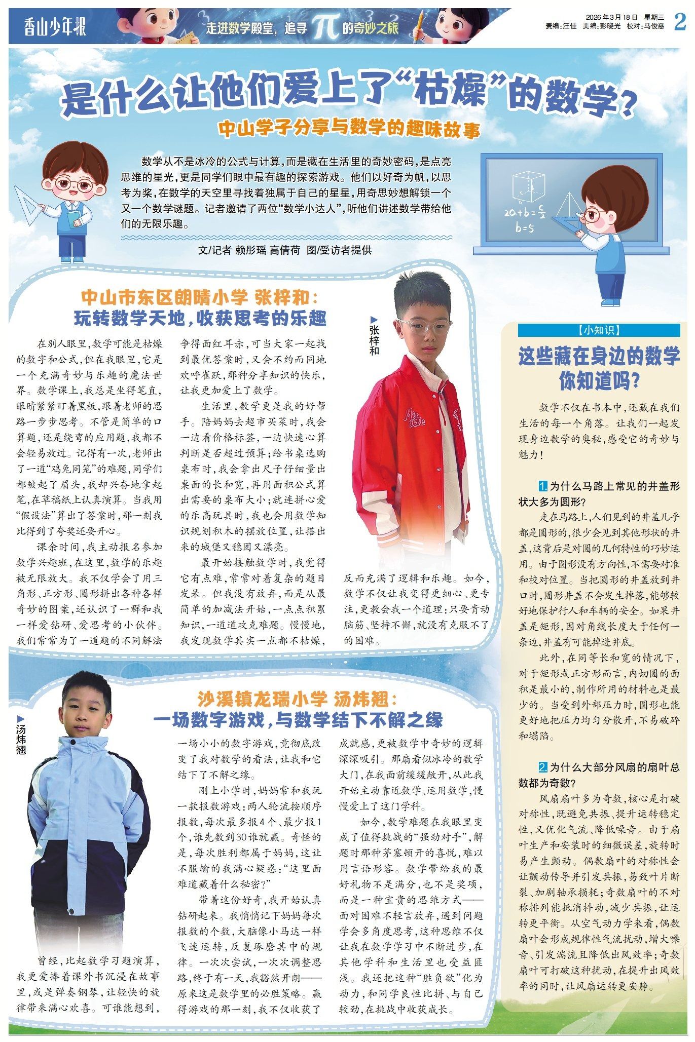 数学从不是冰冷的公式与计算,而是藏在生活里的奇妙密码,是点亮思维的星光,更是同学们眼中最有趣的探索游戏。他们以好奇为帆,以思考为桨,在数学的天空里寻找着独属于自己的星星,用奇思妙想解锁一个又一个数学谜题。记者邀请了两位“数学小达人”,听他们讲述数学带给他们的无限乐趣。(→点击查看详情)