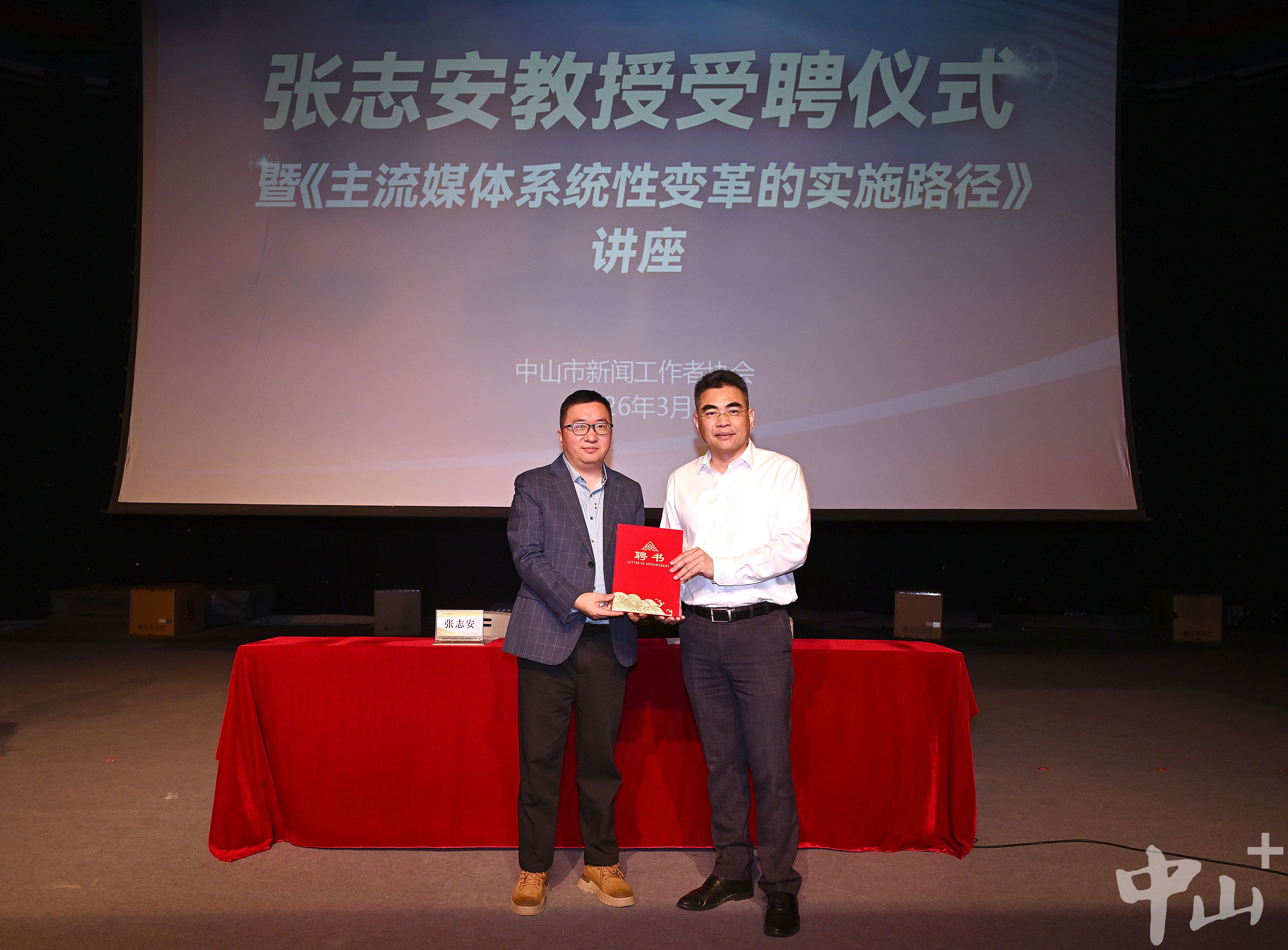 3月19日上午,中山市新闻工作者协会(以下简称“市记协”)顾问聘任签约仪式暨《主流媒体系统性变革的实施路径》专题讲座在中山广播电视台600平方米报告厅举行。复旦大学新闻学院教授、复旦发展研究院传播与国家治理研究中心主任张志安正式受聘为市记协顾问。市记协主席伍学标与张志安现场签署聘任协议并颁发聘书。中山日报、中山广播电视台及各镇街宣传系统工作人员齐聚一堂,共同参与此次专业交流活动。