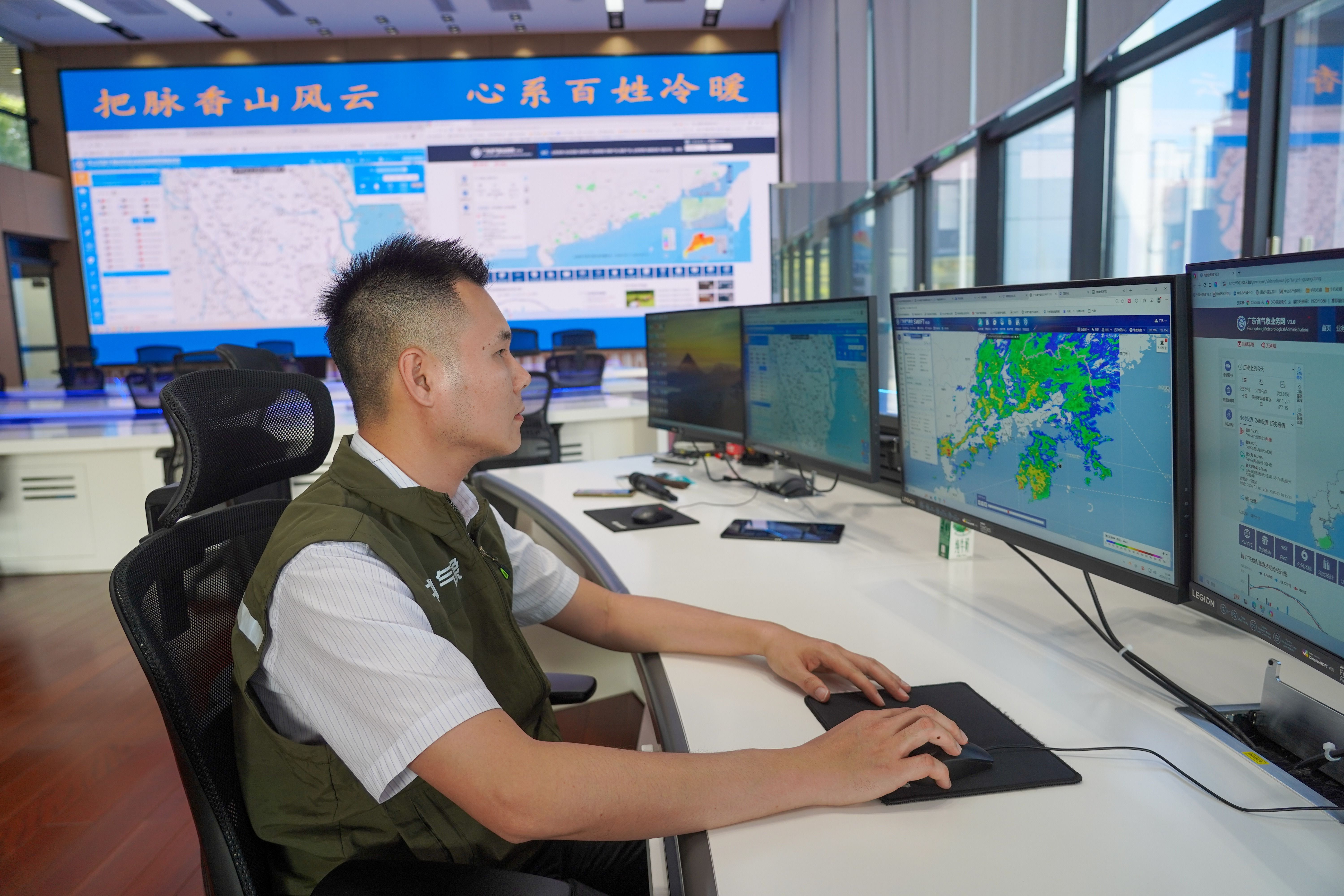 走进预报预警大厅,两块巨大的LED显示屏首先映入眼帘。屏幕上,实时跳动着全市各气象监测站传回的实时数据,清晰标注着中山地形地貌与全域气象分布,直观展现着这座城市的“天气脉搏”,也让我们对气象工作的严谨与专业有了第一印象。据悉,全市3台X波段相控阵雷达和114个区域气象自动站等探测数据已同步接入到这里。