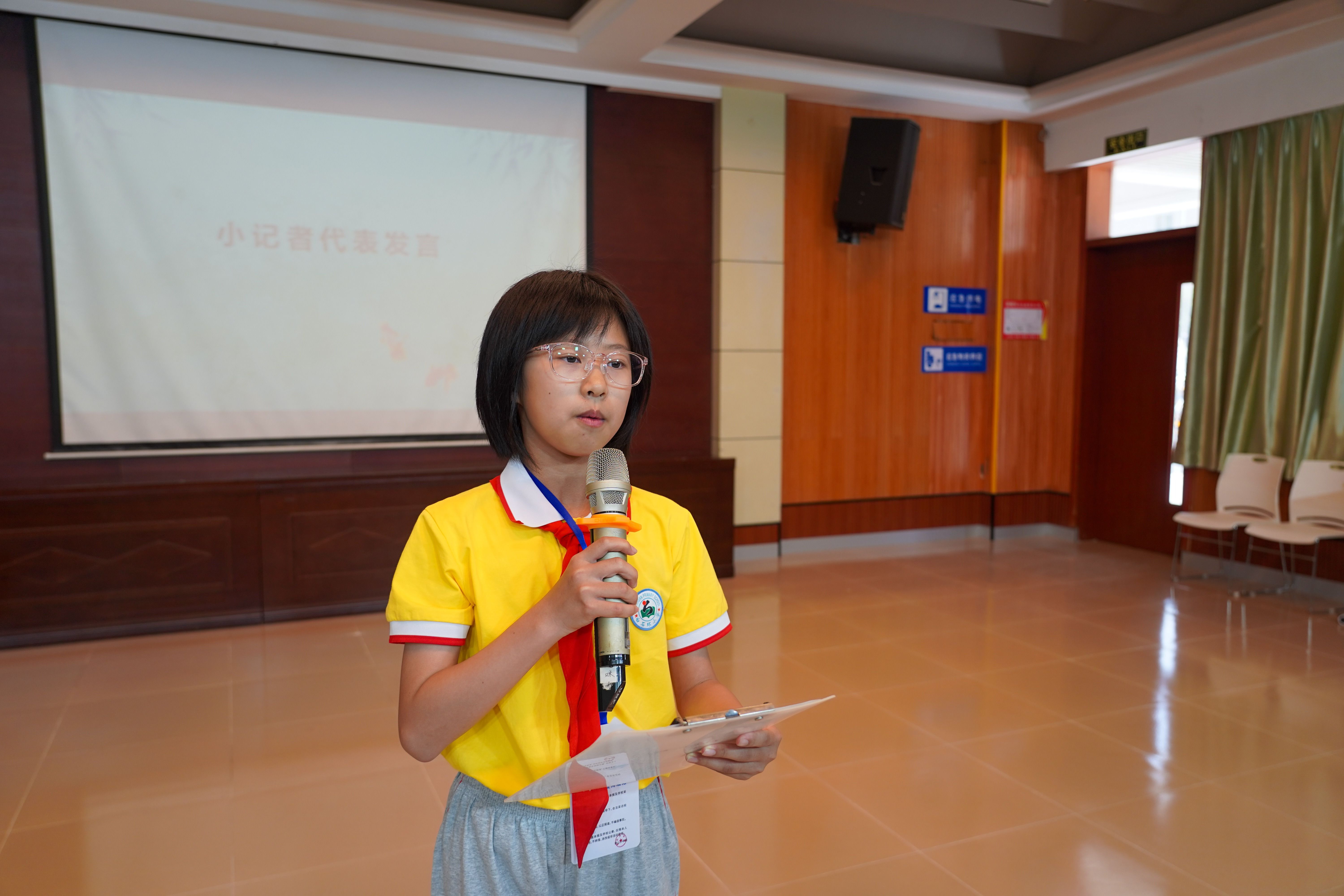 紧接着,六(2)班的简弋同学作为小记者代表发言。“《香山少年报》校园通讯站是我们逐梦的舞台,小记者的身份是我们成长路上的勋章。”她语气坚定地说道,“未来的日子里,我将和所有小记者伙伴一起,怀揣初心、步履不停,以‘事事留心皆学问’的态度,擦亮双眼、用心观察,捕捉校园里的点滴美好,努力成为学校文化的传播者、美好故事的讲述者。”