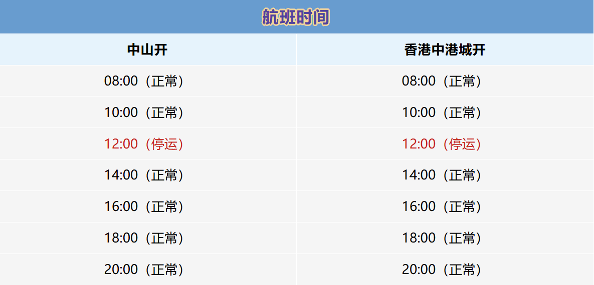 受船舶调度影响,自2026年3月19日(星期四)起,中山往返香港中港城12:00点航班暂停营运 (2026年4月3日-4月7日清明及复活节假期除外)。为配合航班调整,原服务于12:00点航班的免费接驳车将同步暂停运营。请广大旅客留意航班变动,如有出行可改选其他时段航班,提前调整行程安排。