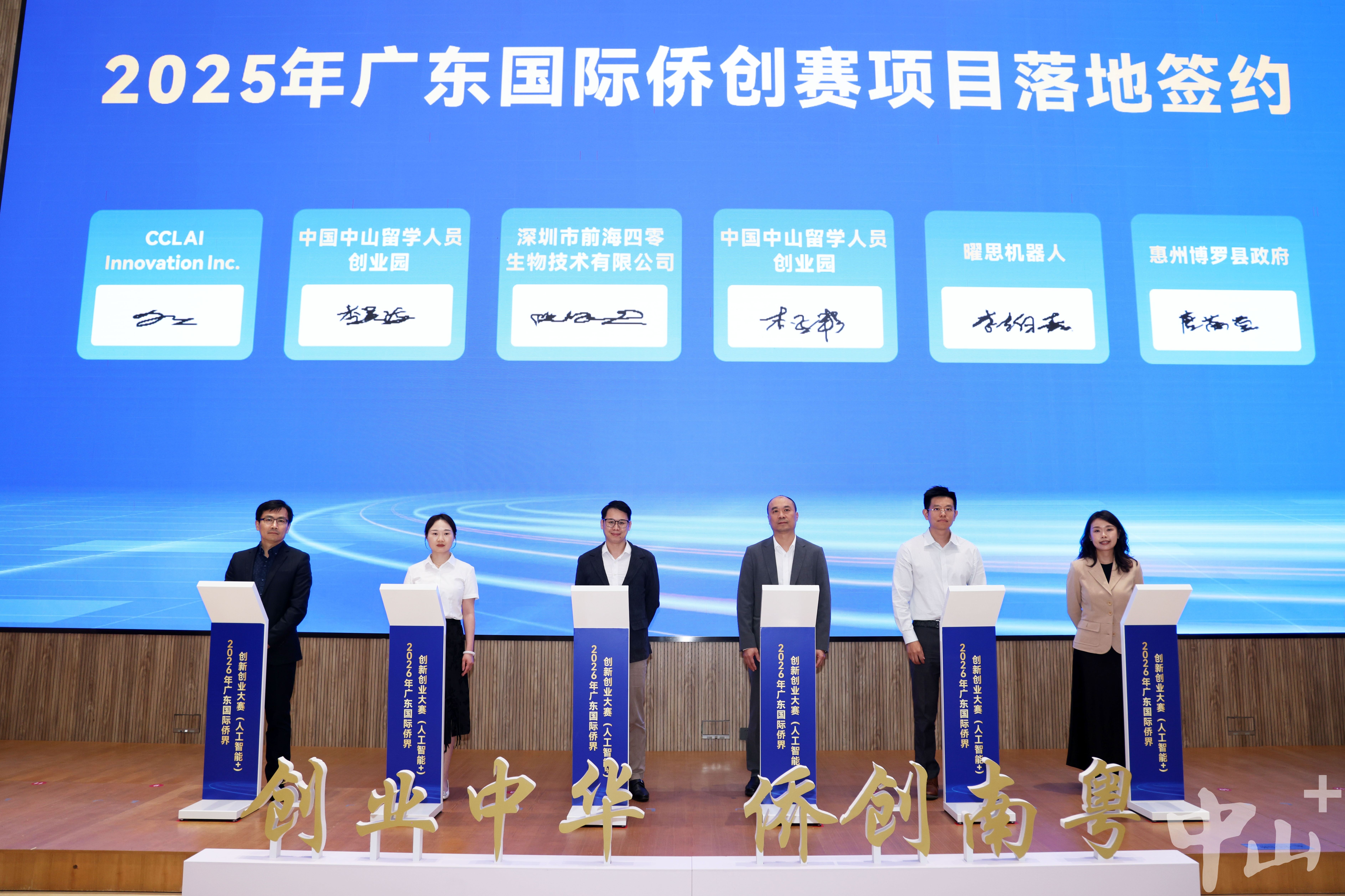 启动仪式上,一系列务实合作紧锣密鼓地展开。中山市侨联与翠亨集团、中山健康基地、中国(中山)留创园等多家本地产业平台现场签署协作协议,将共同构建从项目遴选、孵化加速到产业对接的全链条服务体系。现场,三个分别来自加拿大、中国澳门和深圳的2025年参赛项目正式签约落户中山,生动展现了大赛“以赛引才、以赛促投”的平台价值,并当场带动106个项目踊跃报名。