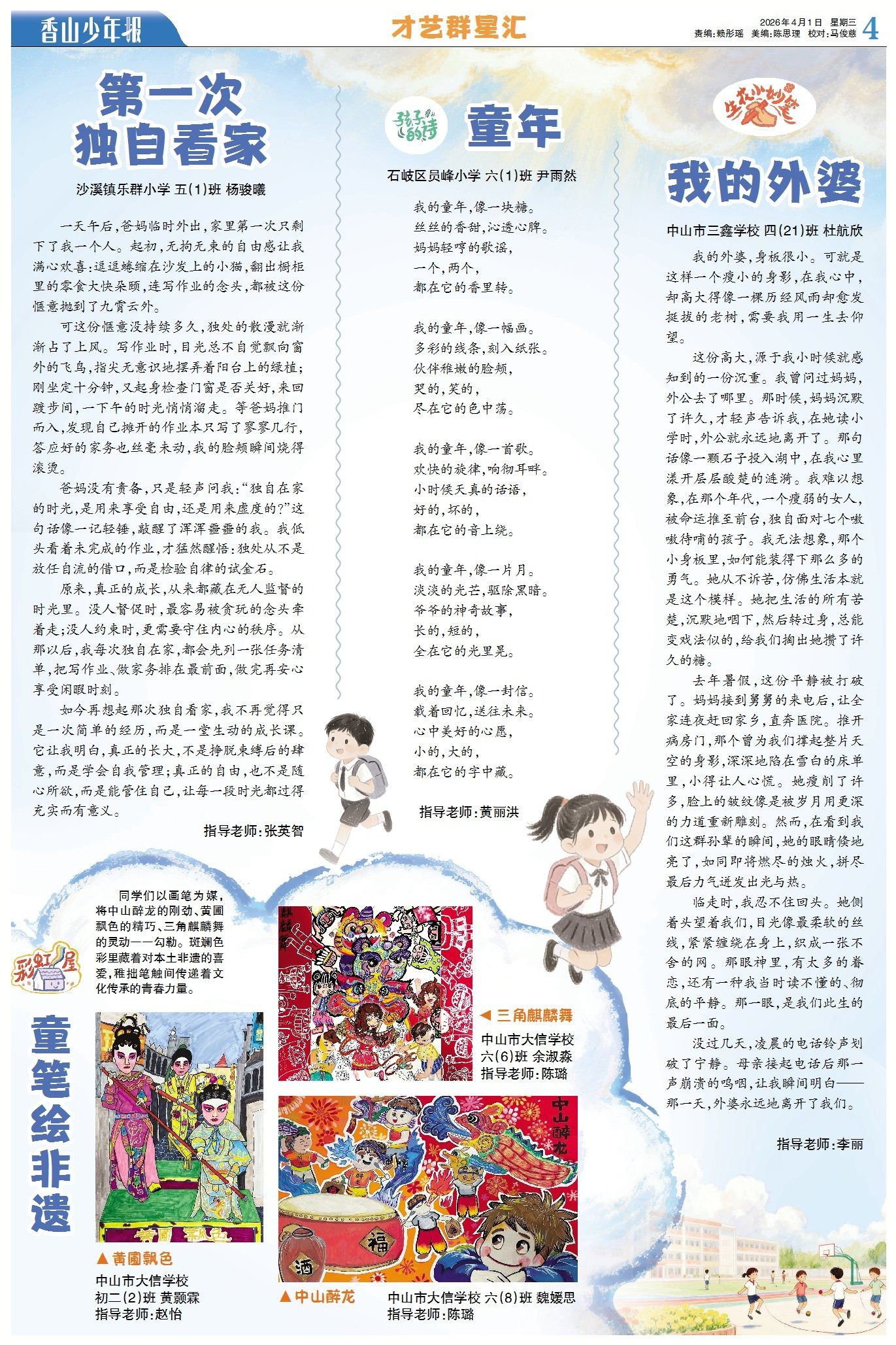 本期《才艺群星汇》,有同学讲述第一次独自看家的经历,明白独处不是放纵,而是考验自律;有同学回忆外婆一生默默扛起家庭重担,表达对外婆深深的敬爱与无尽思念;还有同学用诗意比喻描绘温暖童年,抒发对美好时光的怀念与珍惜。在《彩虹屋》,同学们以画笔为媒,将中山醉龙的刚劲、黄圃飘色的精巧、三角麒麟舞的灵动一一勾勒。(→点击查看详情)