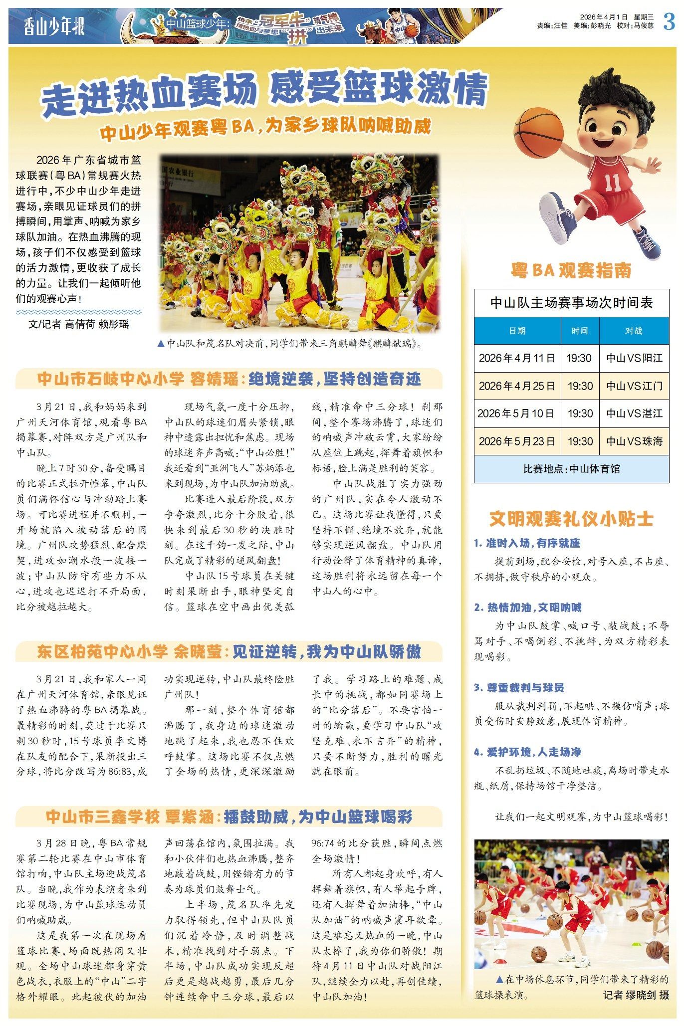粤BA常规赛正火热进行中,不少中山少年走进赛场,亲眼见证球员们的拼搏瞬间,用掌声、呐喊为家乡球队加油。在热血沸腾的现场,孩子们不仅感受到篮球的活力激情,更收获了成长的力量。让我们一起倾听他们的观赛心声!(→点击查看详情)