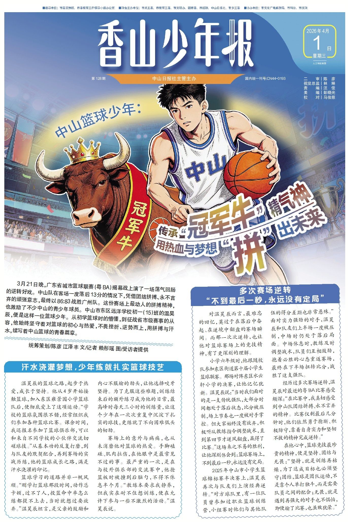 3月21日,粤BA揭幕战,中山队客场落后13分仍顽强逆转,86:83险胜广州队。这份永不言弃的拼搏精神,深深激励了中山少年球员。中山市东区远洋学校初一(15)班的温昊辰,从初学篮球时的懵懂,到征战省市级赛事的从容,他始终坚守着对篮球的初心与热爱,不畏挫折、逆势而上,用拼搏与汗水,续写着中山篮球的青春篇章。(→点击查看详情)