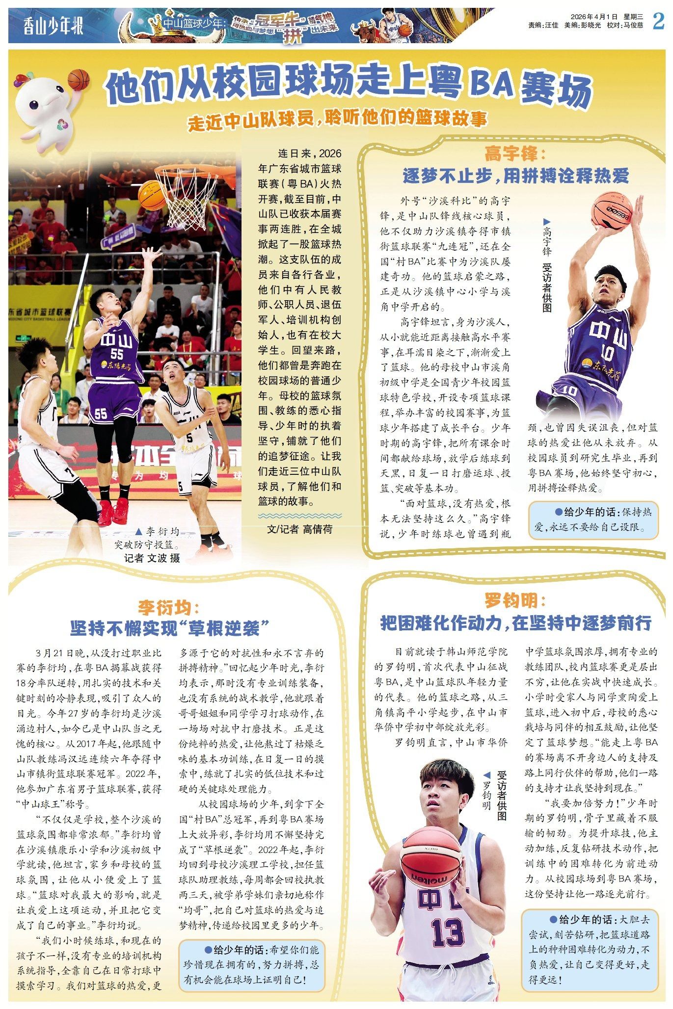 连日来,粤BA火热开赛,截至目前,中山队已收获本届赛事两连胜,在全城掀起了一股篮球热潮。这支队伍的成员来自各行各业,回望来路,他们都曾是奔跑在校园球场的普通少年。母校的篮球氛围、教练的悉心指导、少年时的执着坚守,铺就了他们的追梦征途。让我们走近三位中山队球员,了解他们和篮球的故事。(→点击查看详情)