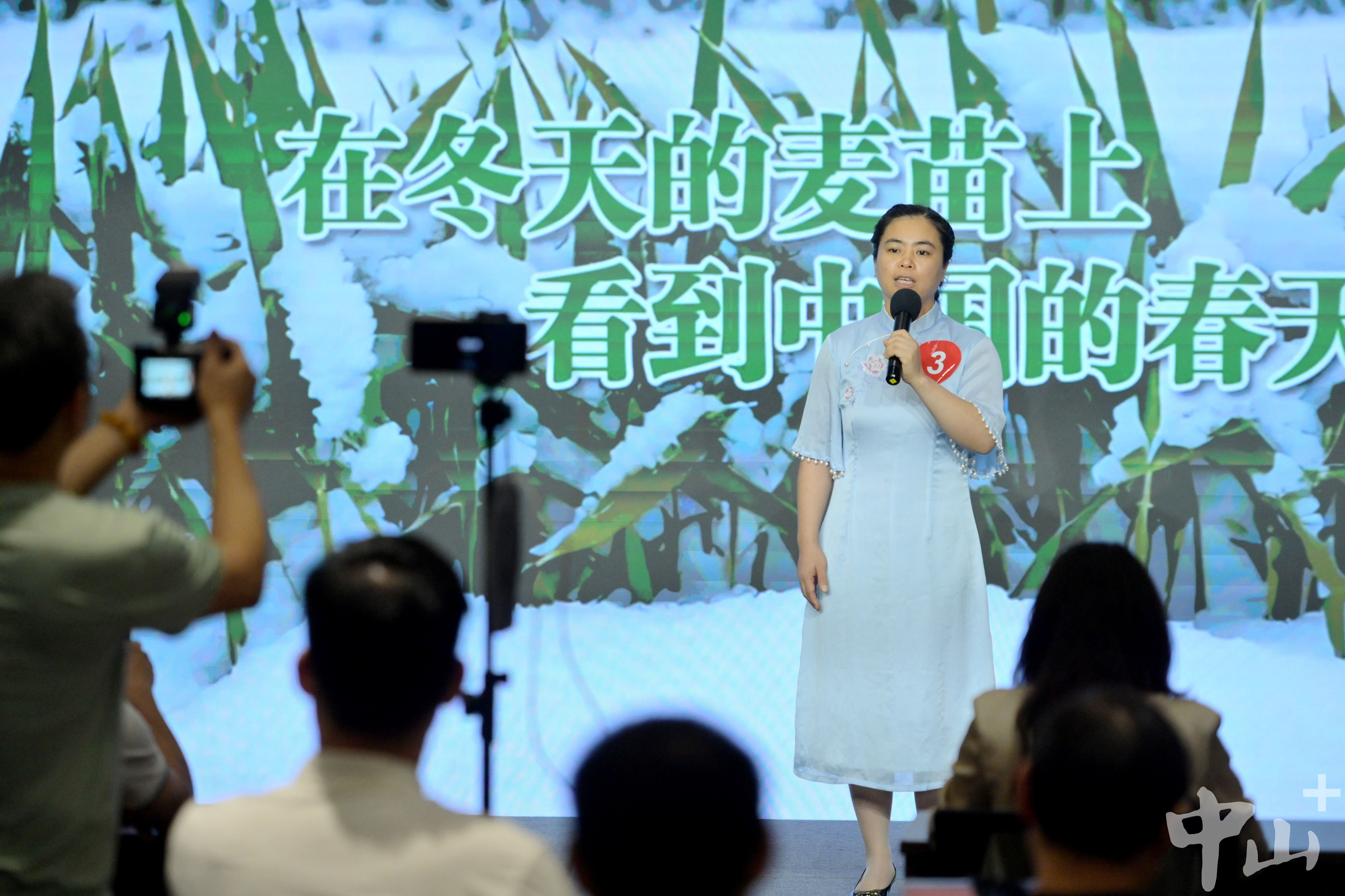身着浅蓝色旗袍的杨艳玲面带笑意,朗诵了《在冬天的麦苗上,看到中国的春天》。“虽然我看不见,但读的时候,脑海里就会浮现出春天的模样,那是充满希望的画面。”朗诵结束,杨艳玲依旧沉浸在文字的意境里。