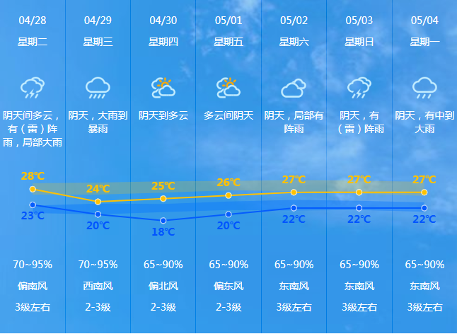 预计今明中山有一次较强雷雨过程,伴有短时强降水与7-9级短时大风天气;展望30日起天气转好,气温有所下降,早晚清凉;5月3号起雷雨天气再趋明显。