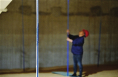 仓储人员进入筒仓检查粮情,头顶是像八爪鱼形状的粮食分流系统。