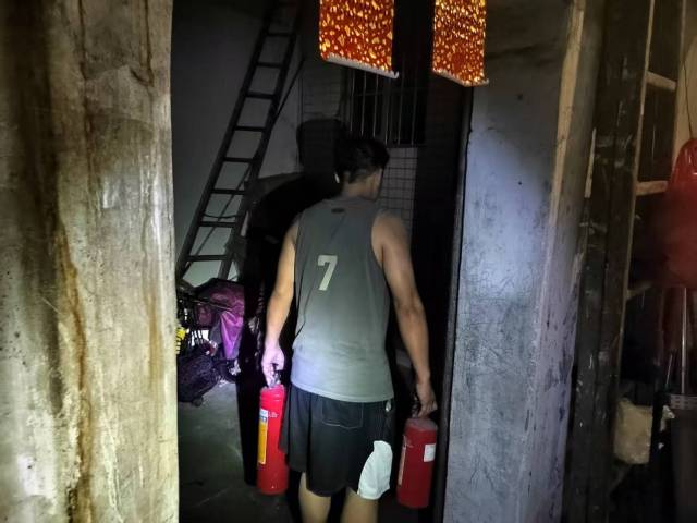 吴金荣曾有过军旅生涯,危机意识让他立刻行动。他来不及穿戴任何防护装备,拿起家中强光手电和两瓶灭火器,直奔起火房屋。