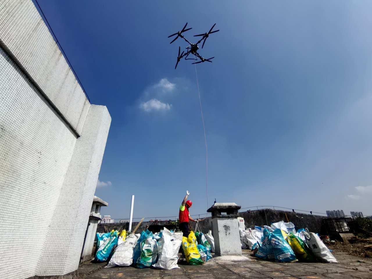 针对天台杂物堆积、易成蚊虫孳生温床的难题,创新使用无人机吊运设备,将废弃家具、建筑垃圾等大型杂物运至地面,完成7栋房屋天台整治,有效消除高空卫生隐患、提升工作效率。行动中共出动7车次清运垃圾51吨。