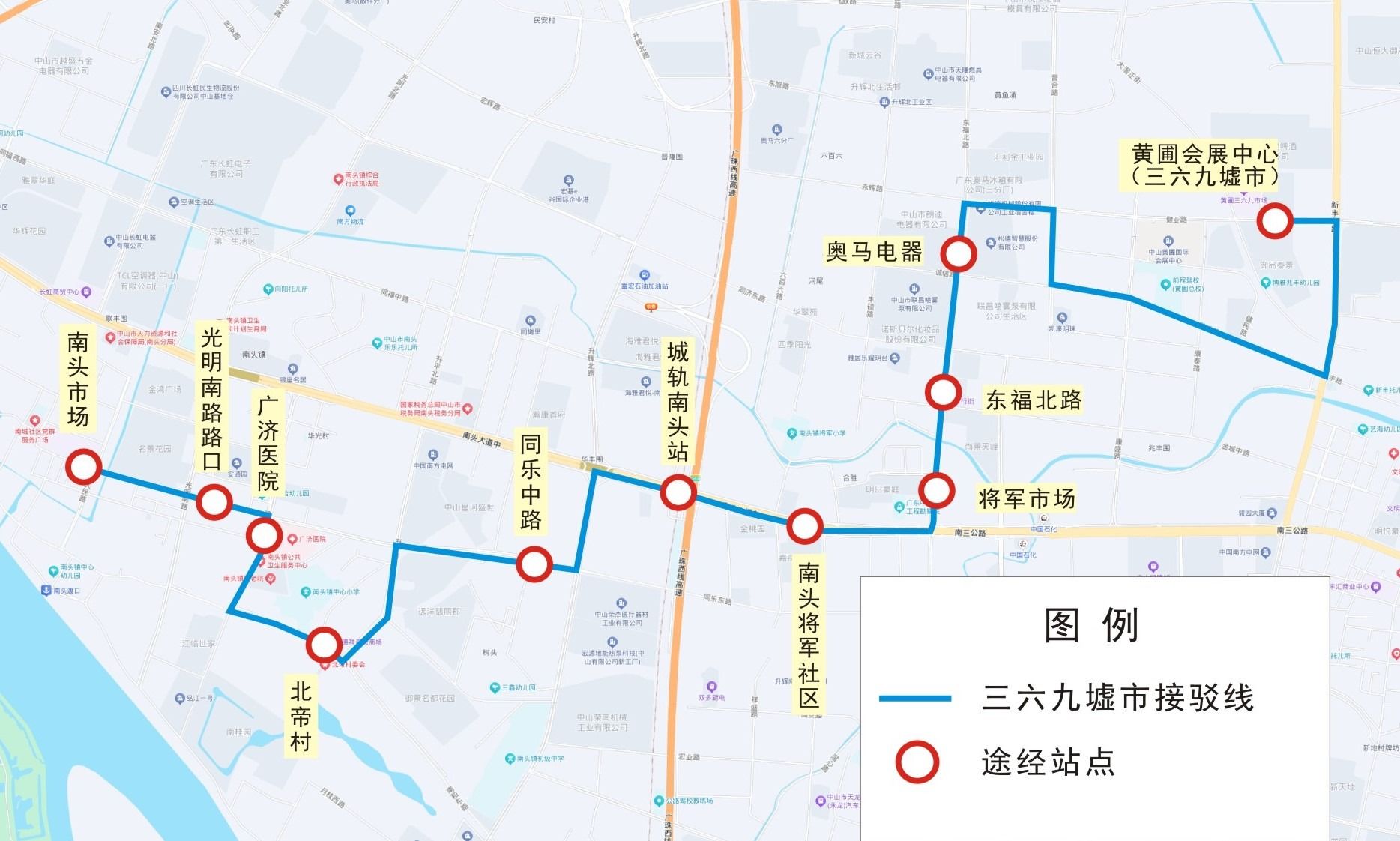 “黄圃三六九墟市”接驳线由“南头市场”站开往“黄圃会展中心(三六九墟市)”站,全程设11个站点,覆盖南头市场、广济医院、城轨南头站、南头将军社区等区域,实现南头镇主要居住区、交通枢纽、大型企业与黄圃三六九墟市的无缝衔接,精准覆盖居民赶墟出行的核心需求场景。