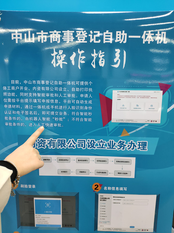 市市场监管局便利营商科工作人员告诉记者,中山市商事登记全程电子化智能申报审批平台对接了国家市场监管总局、省市场监管局、市政务数据管理局、市自然资源局,以及水、电、煤、邮政等部门关联系统,建立了企业名称库、地址库、地址负面清单库、实名核身数据库、失信人员名单库、经营范围库、经营范围智能审批库、自然人受限名单库、非自然人受限名单库等基础数据库,强大的数据支撑使系统非常人性化,如通过自助机申办内资有限公司,不必每个股东都在现场,只需经办人将生成的二维码分享给其他股东,实现远程刷脸操作即可。当然,“申请人自助申报,机器人智能秒批”只能针对部分高度标准化的业务,如开设内资有限公司,办事群众输入企业住所后,如果住所地址不在地址库,系统会出现不符合智能审批条件,转人工审批的提示。据悉,自助机目前处于试运行阶段,接下来将通过银政合作的方式,向全市推广。