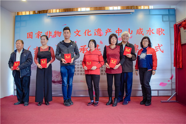 东升咸水歌家喻户晓,上有70多岁老人传承,下有3岁孩童学唱,东升咸水歌不断得到推广。为更好传承和发扬岭南沙田水乡特色文化,推动咸水歌文化发展,2019年12月31日上午,由中山市非遗保护中心颁发的国家非物质文化遗产中山咸水歌(东升)传承基地正式成立,并举行揭牌仪式,市镇相关部门代表及一众民间文艺专家等到场参加了揭牌仪式。
