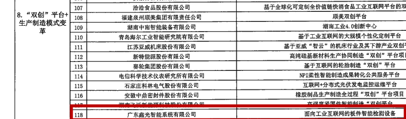据广东鑫光智能系统有限公司介绍,缺少自动化、网络化、智能化的检测系统是板材加工行业智能化的最突出一块短板,面向工业互联网的板件智能检测平台完善了板材生产的这一重要的环节,因此以“生产制造模式变革”入选2019年制造业“双创”平台试点示范项目。