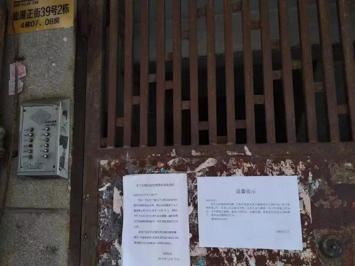 ▲社区工作人员在小区铁闸门上张贴温馨提示