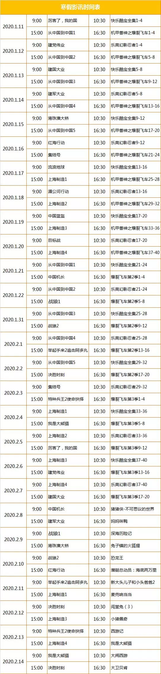 具体播映时间为1月11日至1月23日、1月31日至2月14日期间,每天9:00、10:30、15:00、16:30各一场,播映地点为市妇儿活动中心1号楼一楼投影室。
