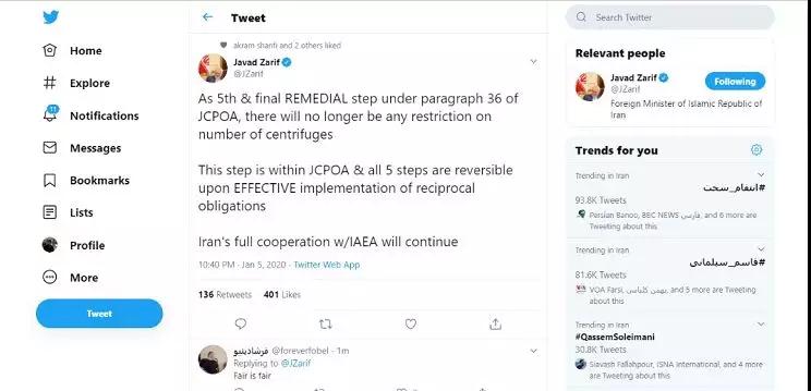 △伊朗外交部长扎里夫在社交媒体上发文称,作为第五阶段也是最后一个“补救”步骤,将针对伊核协议第36条,对离心机的数量将不再有任何限制。