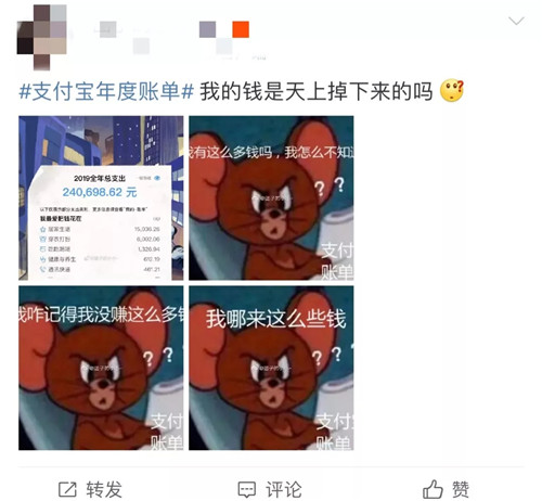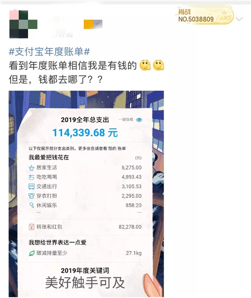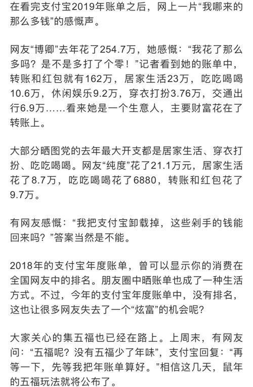 不过2019年支付宝年度账单很特别,相比2018年更加克制,不再展示支付宝账单的花费排名。网友直呼,没有排名,就缺少了探寻朋友圈藏着多少隐形富豪的机会。