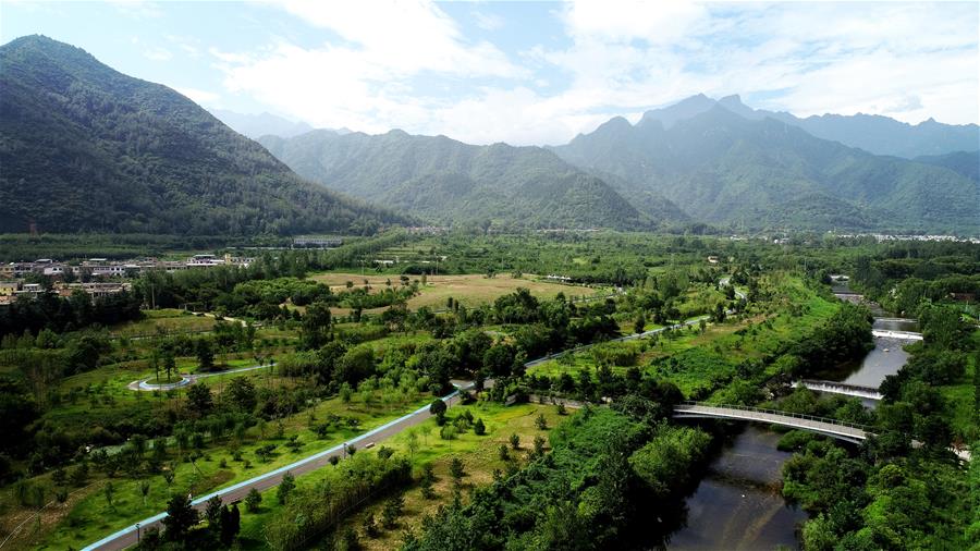 陕西省西安市长安区秦岭违建别墅“群贤别业”拆除后建设的秦岭和谐森林公园(2019年7月26日无人机照片)。新华社记者 刘潇 摄