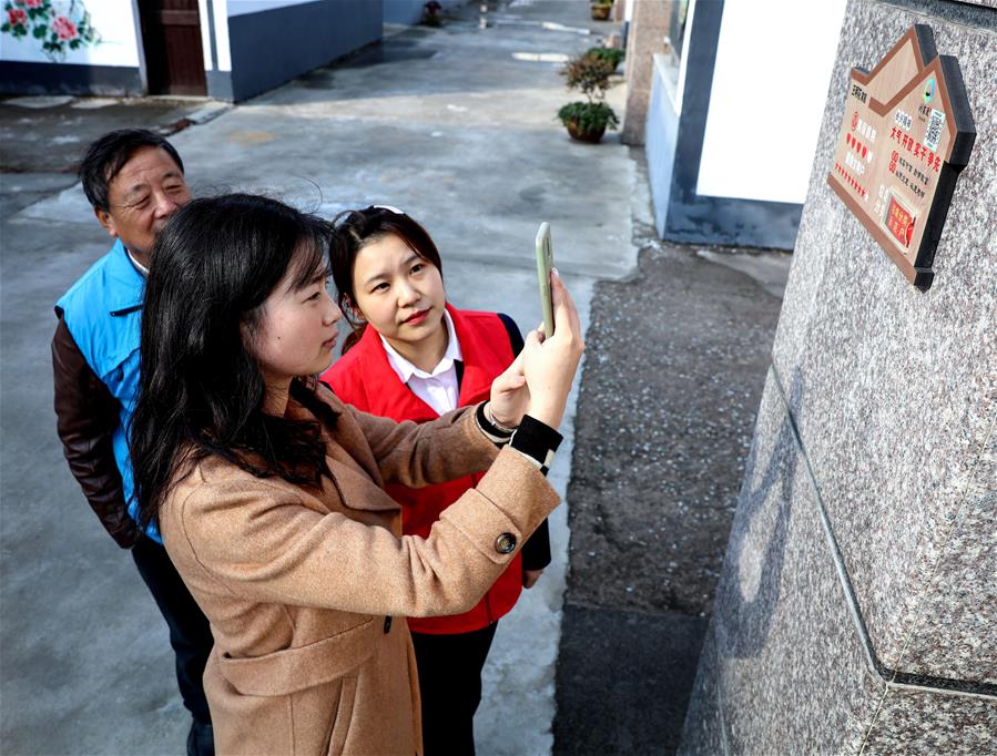 浙江省长兴县李家巷镇刘家渡村村民(前)在党员志愿者的指导下,用手机扫描二维码(“村务e点通”),查看最新的文明诚信档案考评结果(2019年11月28日摄)。 新华社记者 徐昱 摄
